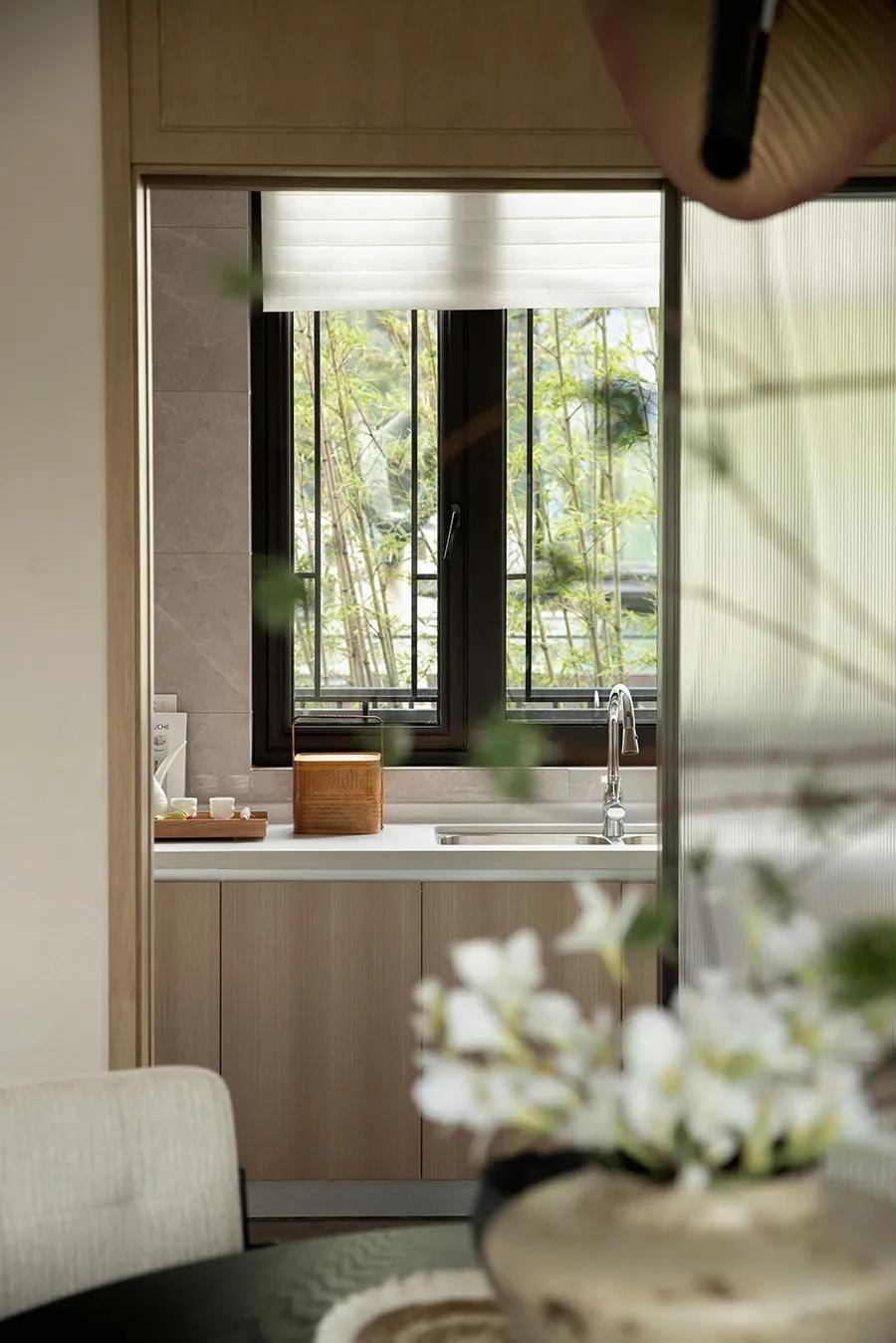 在整体公共空间中,设计师再创造“局部”,营造出室外阳台、餐厅、餐厨的三进布局关系。在充分考虑功能性的同时,进一步扩展用餐时的舒适度。推开移门,风自由出入,内外之间,流动着空间的“气韵”。食物的清香与自然的清新混合在一起,共同构成生活的本味。