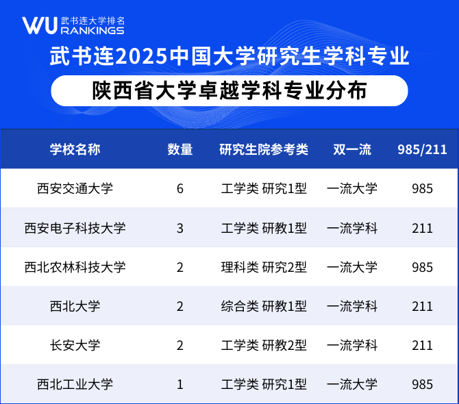 西安交通大学以6个卓越学科专业位居第一,西安电子科技大学3个卓越学科专业位居第二。