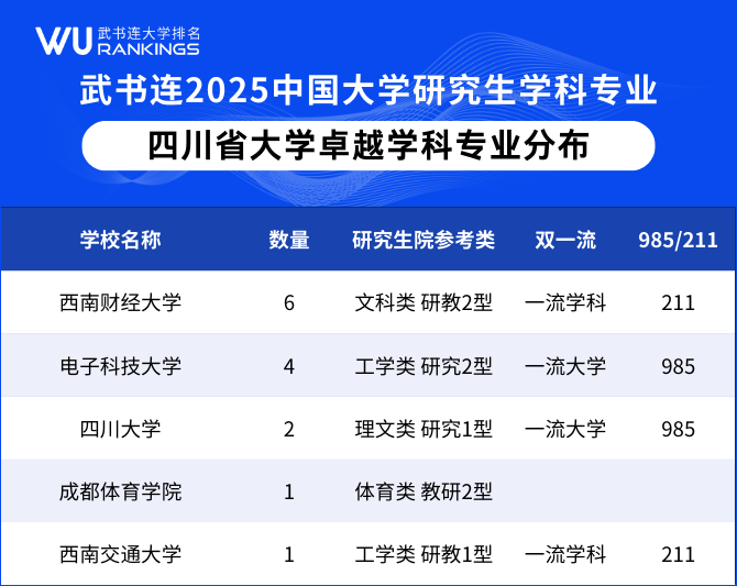 西南财经大学以6个卓越学科专业位居第一,电子科技大学4个卓越学科专业位居第二。
