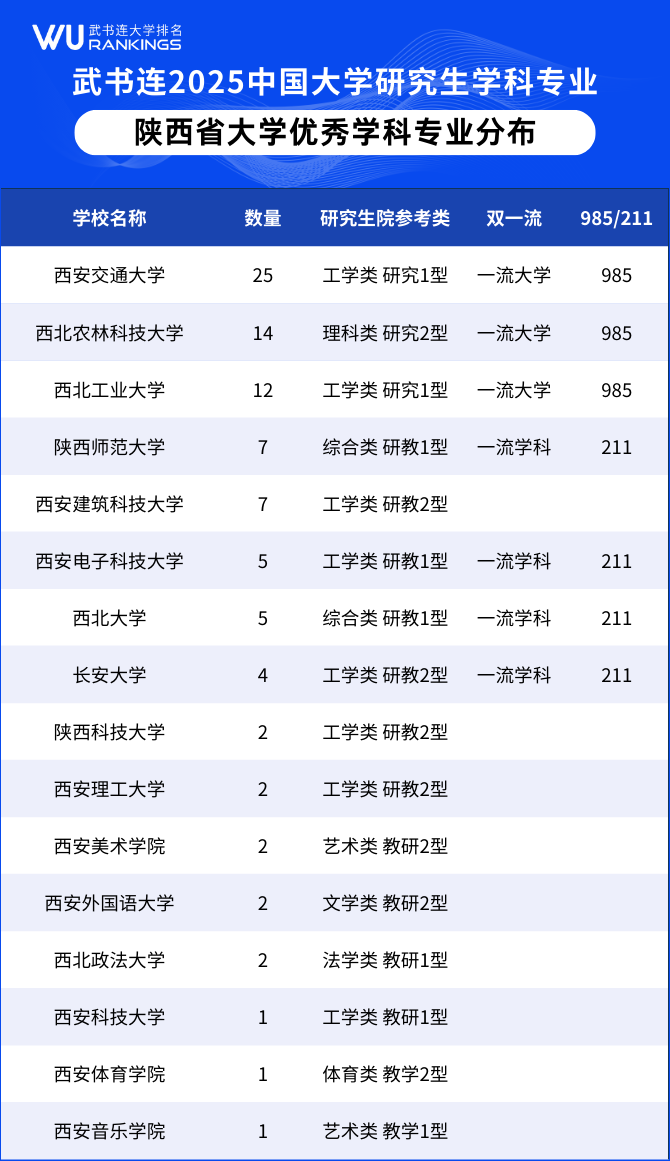 西安交通大学以25个优秀学科专业位居第一,西北农林科技大学14个优秀学科专业位居第二,西北工业大学12个优秀学科专业位居第三。