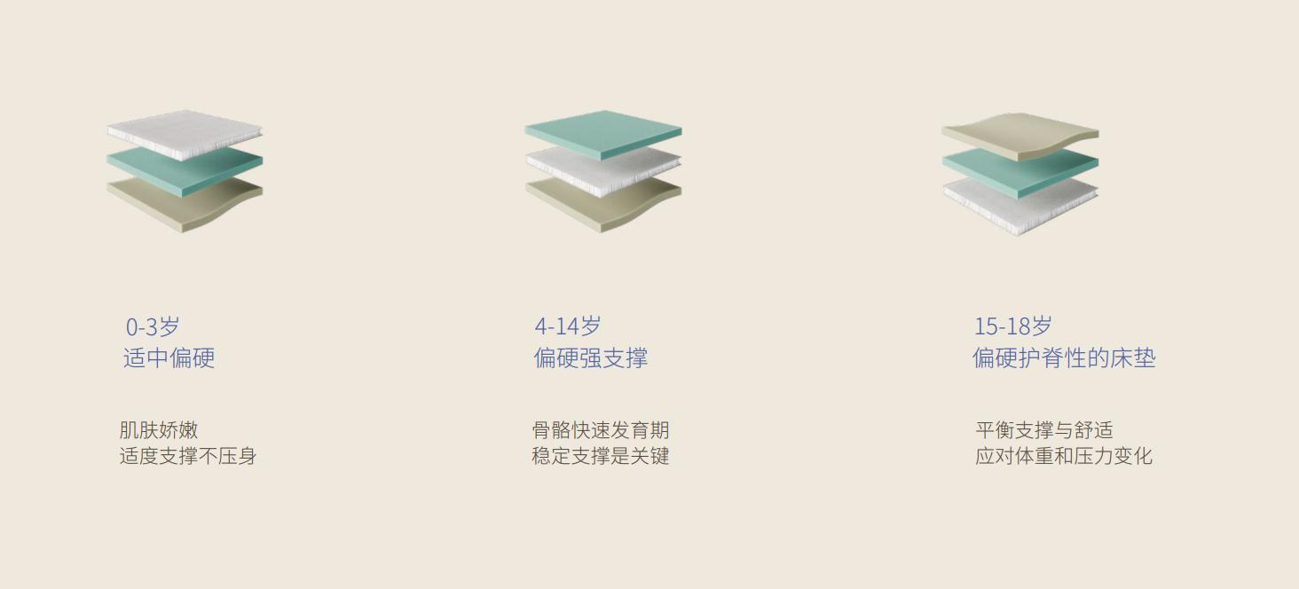 ● 13岁以上:青春发育期体重增长快,建议分区支撑床垫,腰部区域加硬设计 。