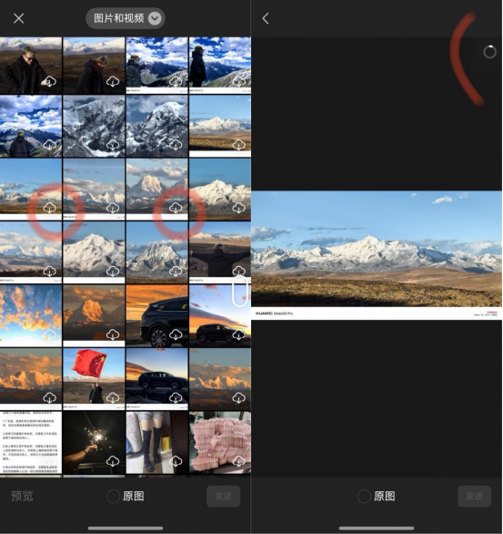 最让我惊喜的是,即使本地是“瘦身”版,当我想发朋友圈时(红圈图标表示云端照片or视频),在图库里选中照片点击分享到微信,它竟然能“无感”直接调用云端的高清原图发送!(右上角显示从云端下载发送情况) 这流畅度,跟我之前拍完直接发图几乎没区别!