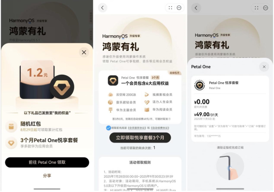 旅程后半段轻松多了,拍照再无后顾之忧!回国后,我的手机提示升级HarmonyOS 5.1,我果断升了。升级完在桌面右滑进入负一屏,看到焕新的“鸿蒙有礼”活动,就顺手签了个到。嘿!运气爆棚,第三天就抽中了“大奖”——3个月的Petal One悦享套餐!里面包含了200GB的云空间会员!