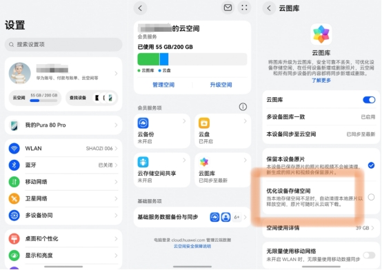 情急之下赶紧查攻略,都说华为手机拯救存储空间的“救命稻草”是华为云空间的云图库,开启“云图库”功能后,华为云空间可以自动将本地高清版本的照片、视频存储至云端,还支持自动释放本地存储空间,我赶紧开通试试!