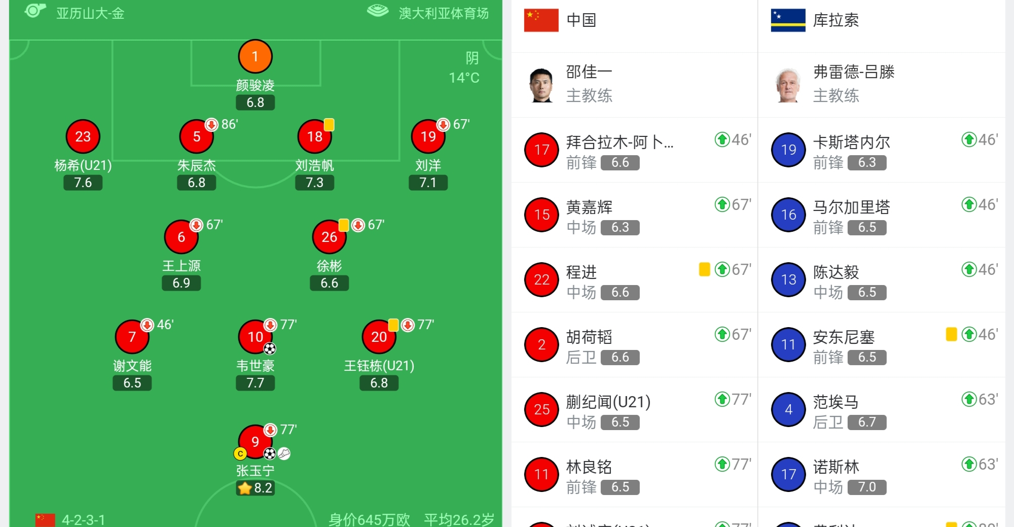 本场比赛,韦世豪身穿10号球衣首发出战,同样出场了77分钟。上半场补时阶段,韦世豪接张玉宁传球,没有过多地停球,而是选择抽射,随后成功破门。数据显示,韦世豪完成了26次触球;传球成功率高达82%;5次射门,2次射正,均为本场最高;直接打进了1球。能够看出来,韦世豪与张玉宁状态非常好,他们都为国足拿下比赛做出了不小的贡献。