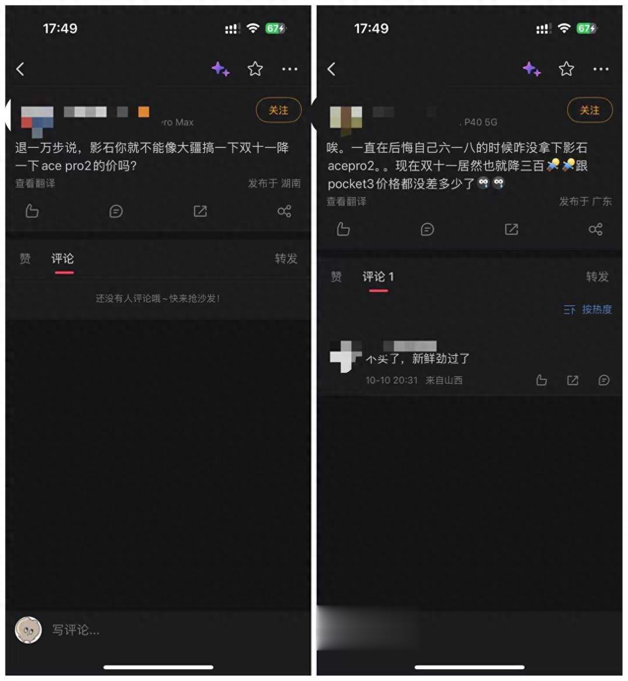 但在此之外,影石并未以同样的大力度促销“迎战”。「电厂」关注到,多位消费者与各类社交平台发布有关影石双十一促销力度不及大疆的相关消息。