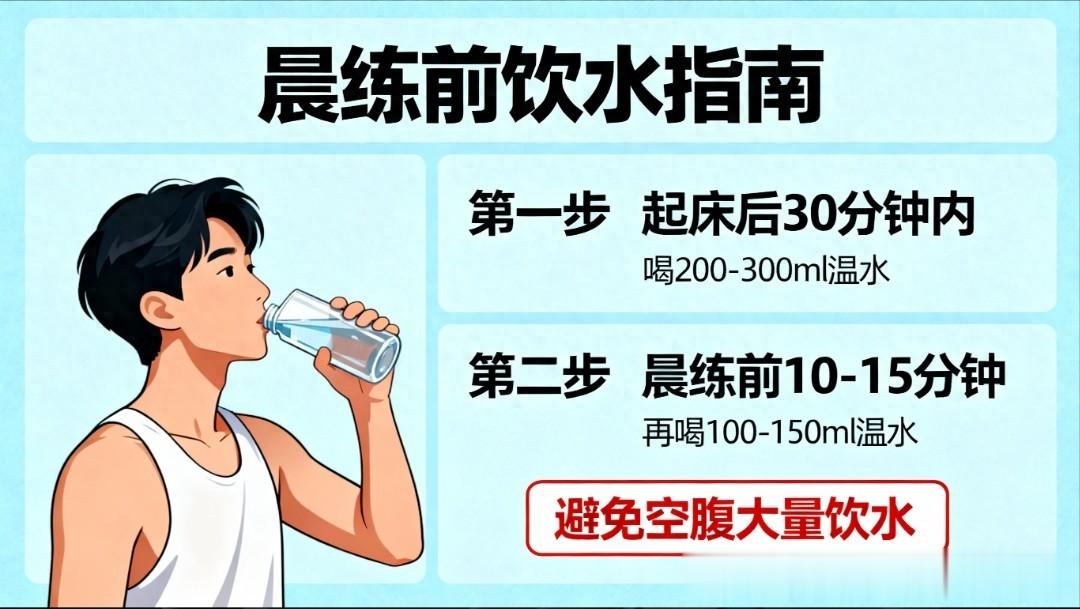 虽然晨练前喝水有益,但不宜一次性大量饮水,以免引起胃部不适或增加心脏负担。应逐渐小口饮用,避免过度膨胀胃部。