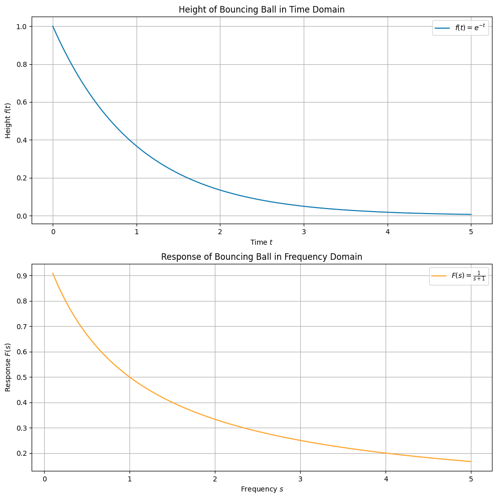 第二个曲线展示了小球在频域中的响应函数。这个函数表示了小球的高度衰减在频域中的表现形式,通过拉普拉斯变换从时间域转化而来。