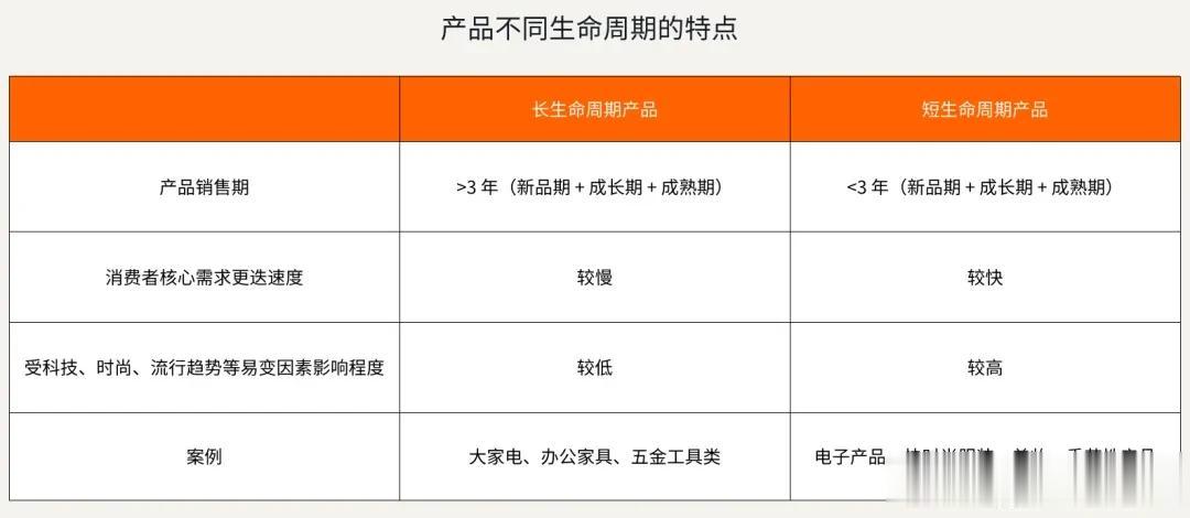 在需求稳定性上,长生命周期产品核心功能需求多年不变(如桌椅承重),短生命周期产品则每年 / 季度迭代(如服装版型、手机芯片);