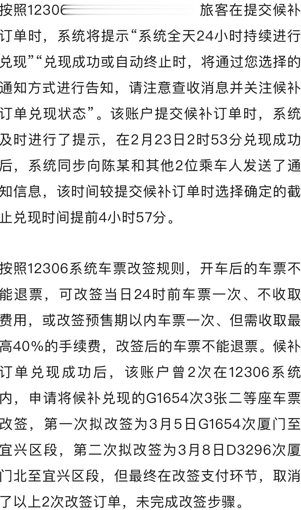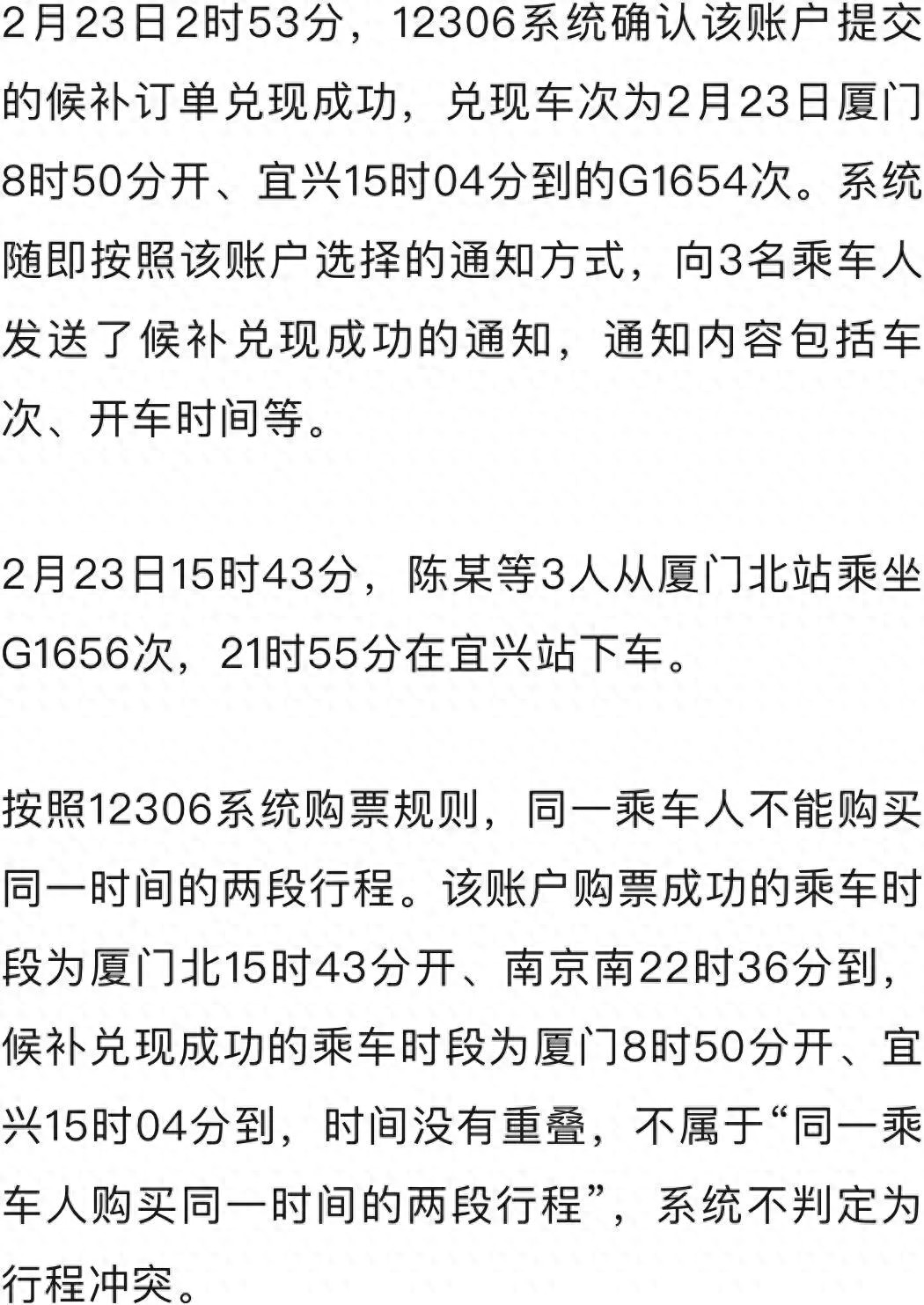 12306系统后台显示,注册为陈某的12306账户,于2月19日11时09分,下单候补2月23日厦门(厦门北)至宜兴的二等座3张,选择车次为G1654等,填写乘车人为3人,预付票款1674元,选择确认的截止兑现时间为开车前1小时,通知方式为微信通知1人、短信通知2人。2月22日18时44分,该账户下单购买了3张相同乘车人的2月23日G1656次二等座车票,购票区段为厦门北至南京南,厦门北15时43分开,南京南22时36分到,支付票款1755元。购票成功后,该账户未取消此前提交的候补订单。