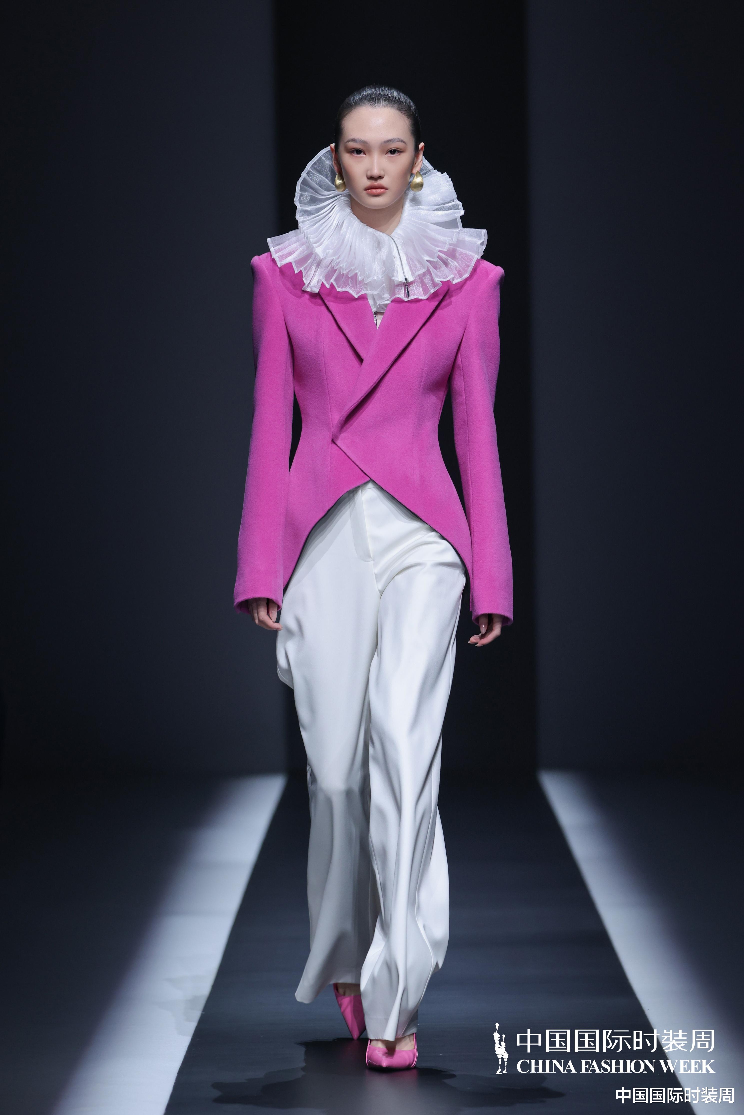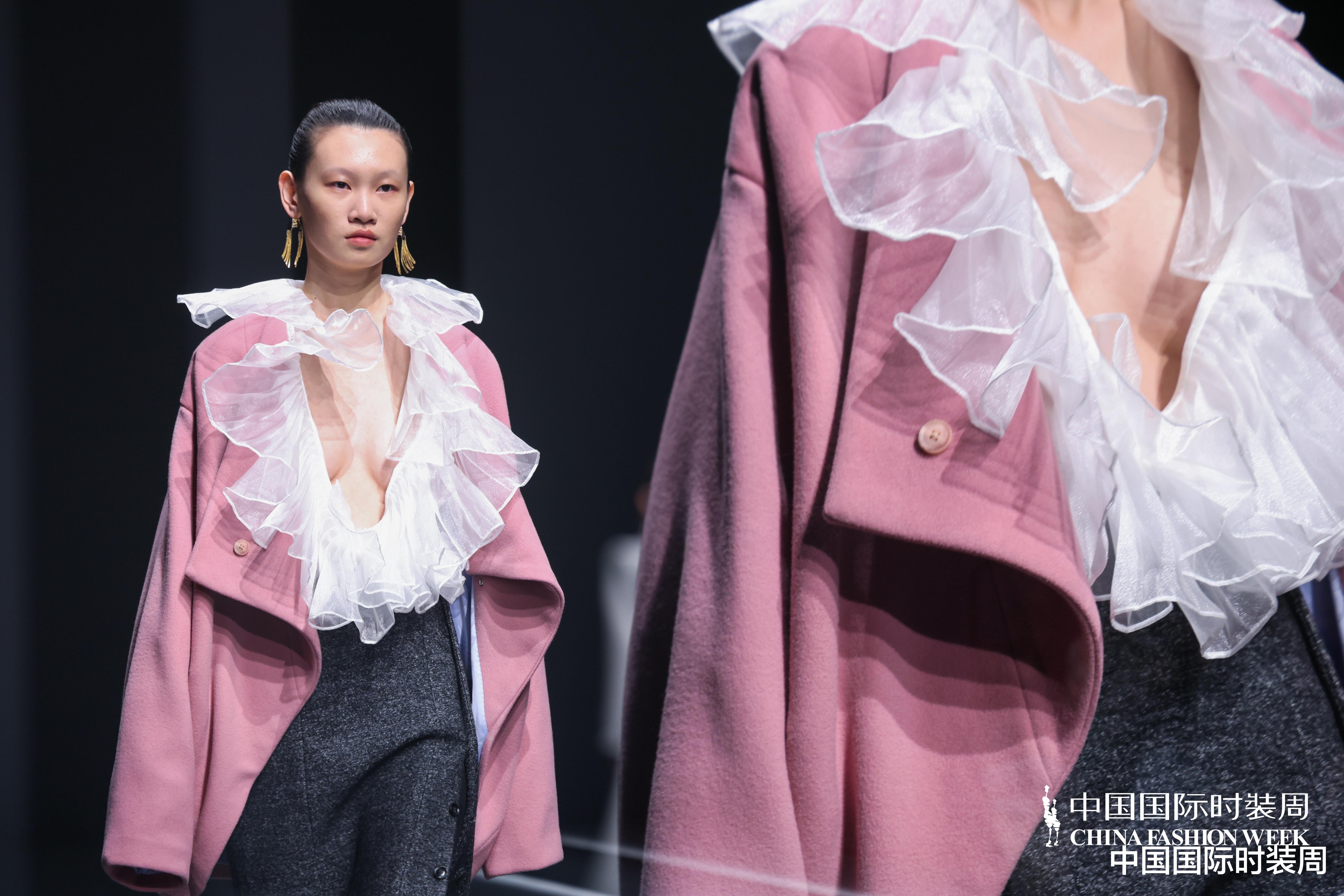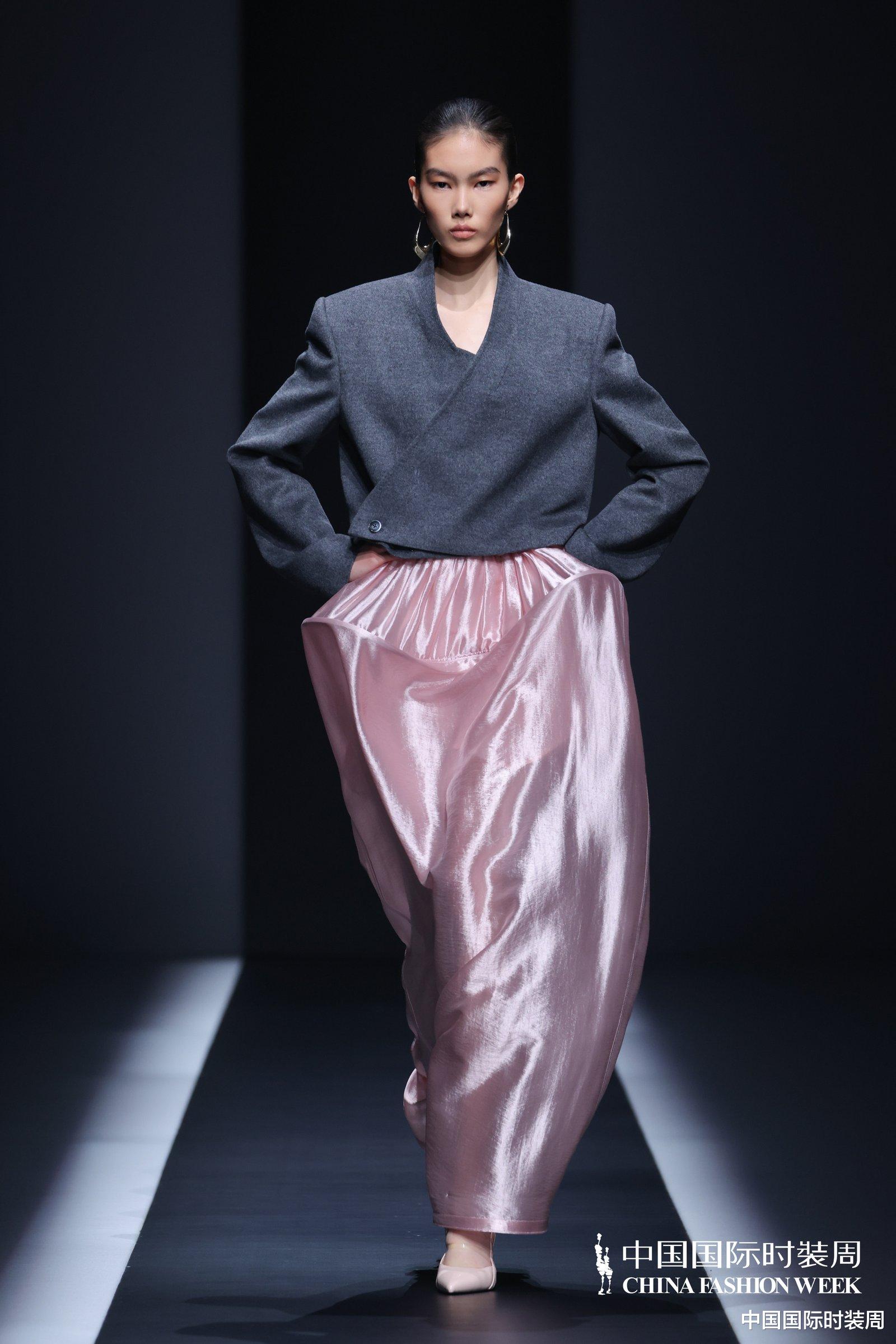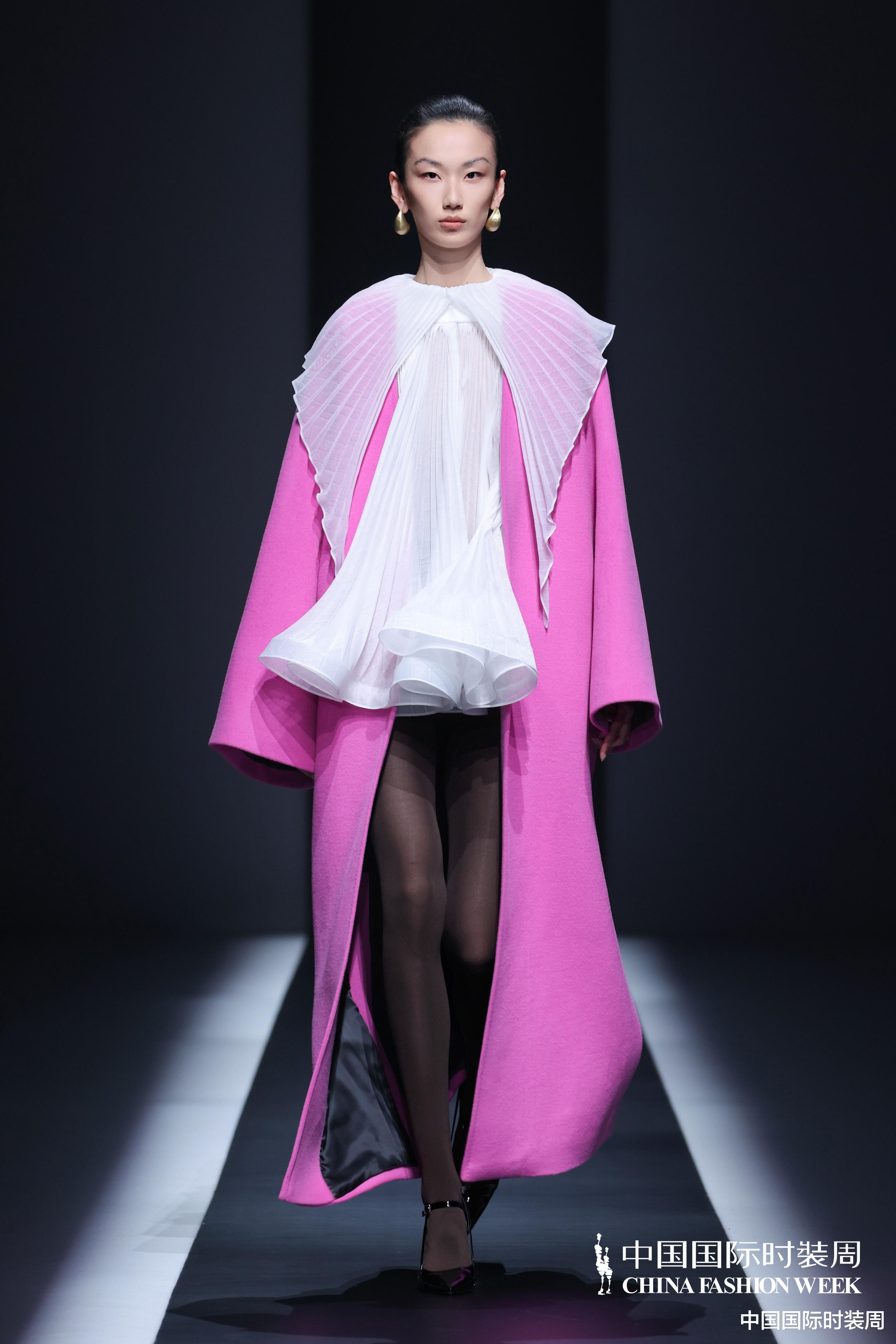 秀场之上,灯光渐亮、旋律奏响,模特身着玫粉色长款大衣,搭配压褶工艺打造的白色花瓣裙优雅登场,将“我”对世界最初的懵懂感知,悄然藏于衣物肌理之中;随着旋律鼓点逐渐加重,象征着成长历程的推进,服装色彩从明艳热烈的玫粉,渐变为低调内敛的炭灰、中灰与浅灰蓝。颈部缠绕的线条、肩部利落的轮廓、胯部扩张的结构、衣身斜向交错的剪裁,生动勾勒出成长路上和谐与冲突共生的状态;最终,以克制沉稳的酒红色调、舒展自在的服装造型,呈现出当下“我”对世界的成熟理解与全新感知。此外,设计师宋双以独特的设计语言,重新演绎16世纪拉夫领与中世纪欧洲裙撑经典元素,融合建筑美学结构特点,打造出极具空气感的造型,成为秀场一大亮点。