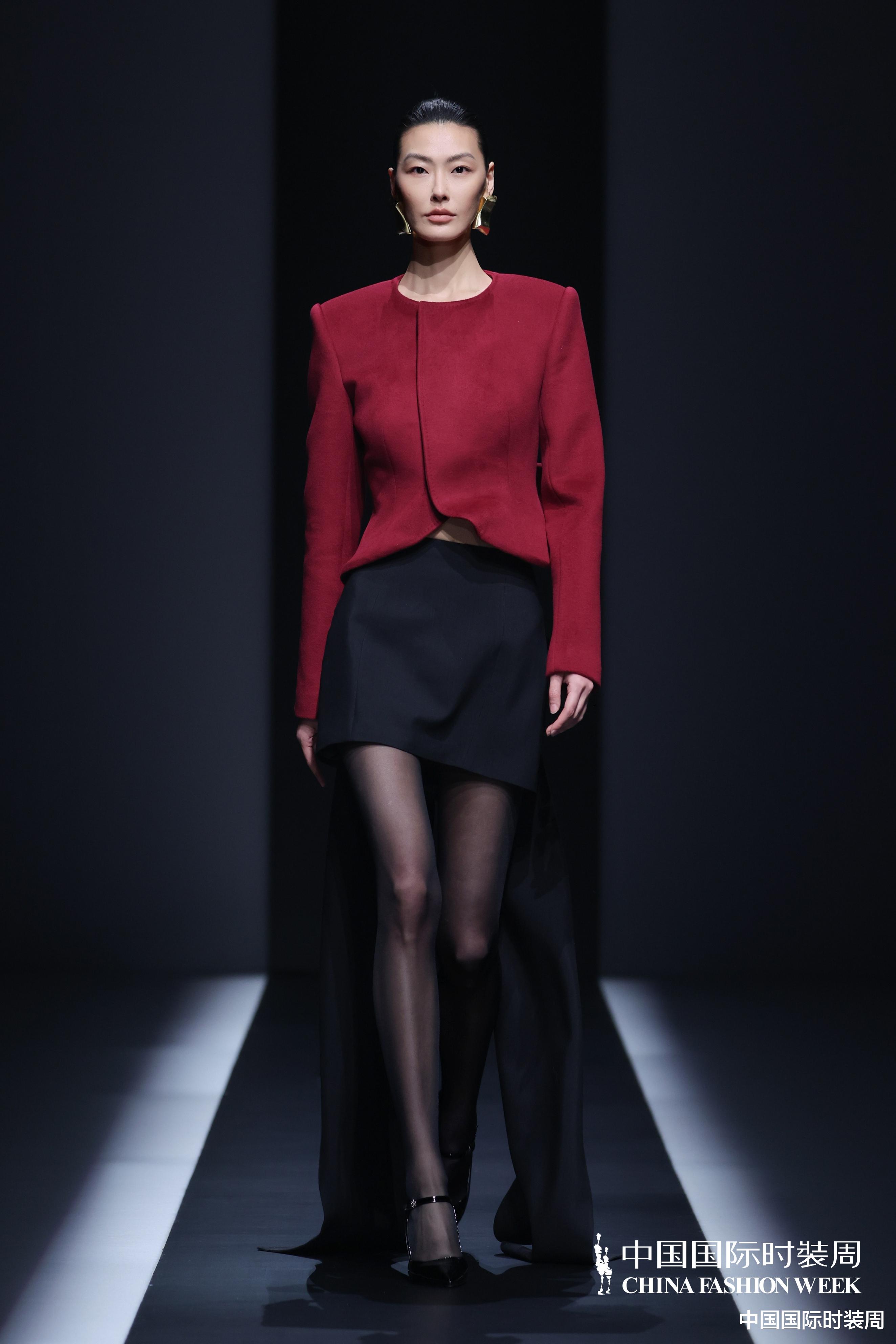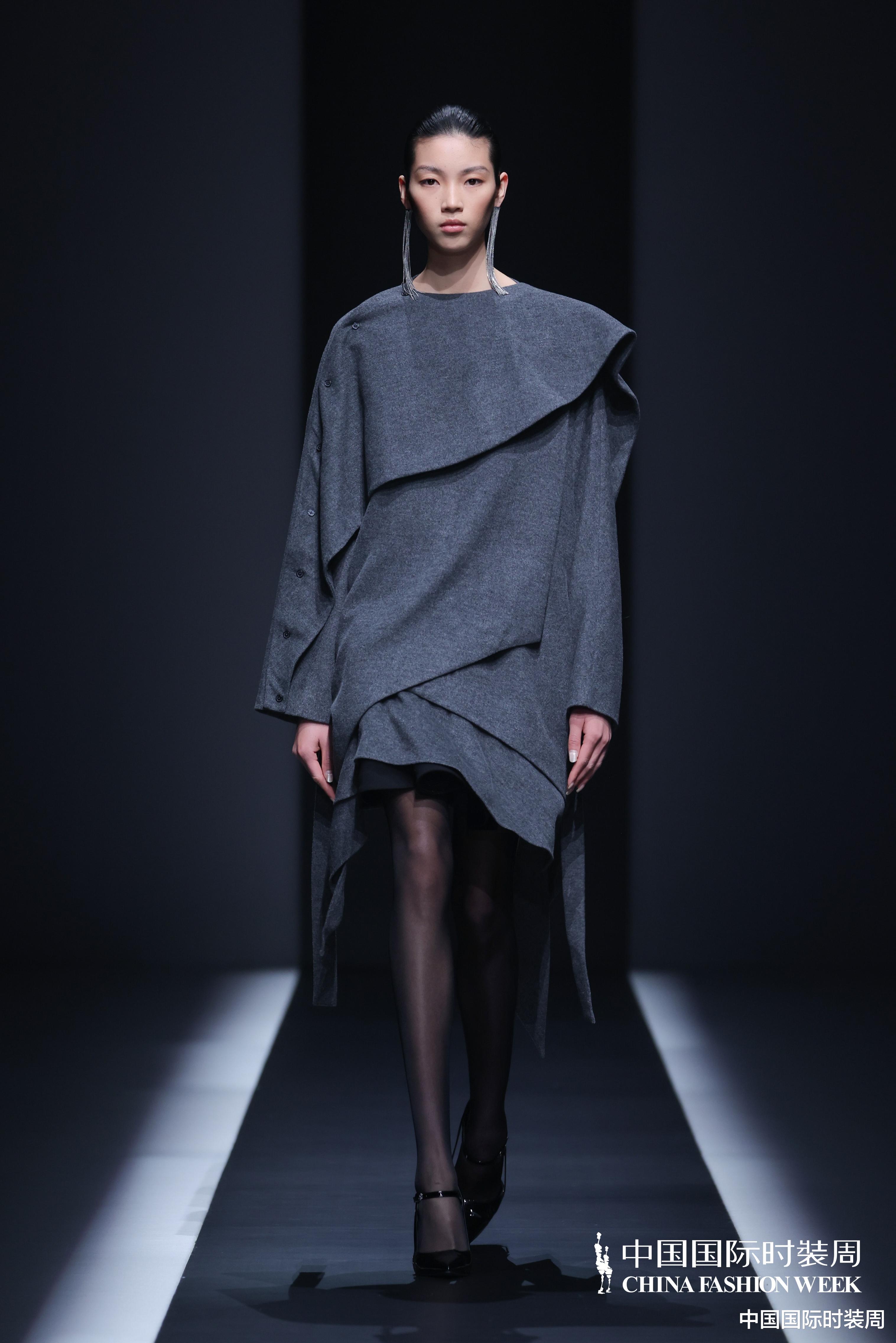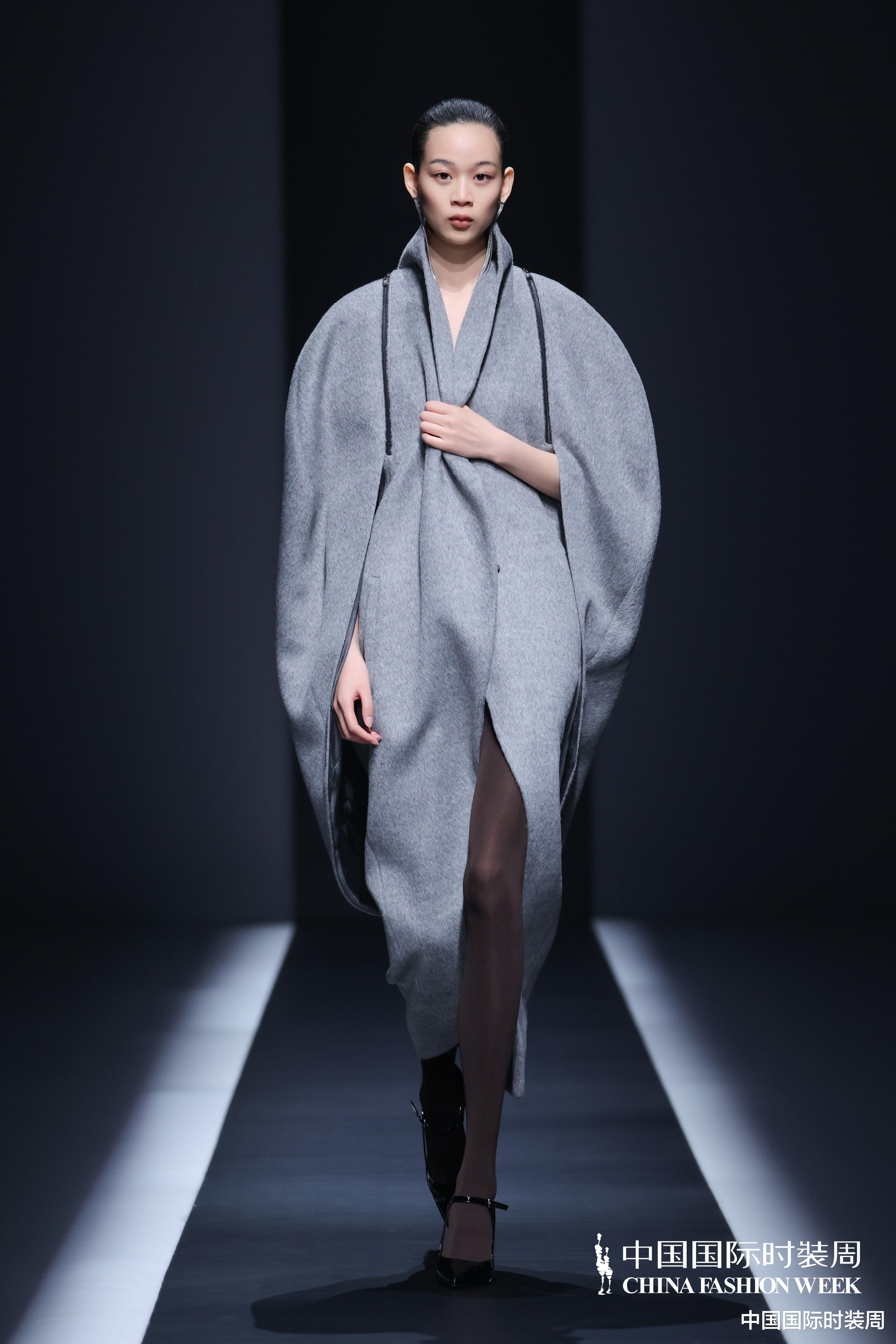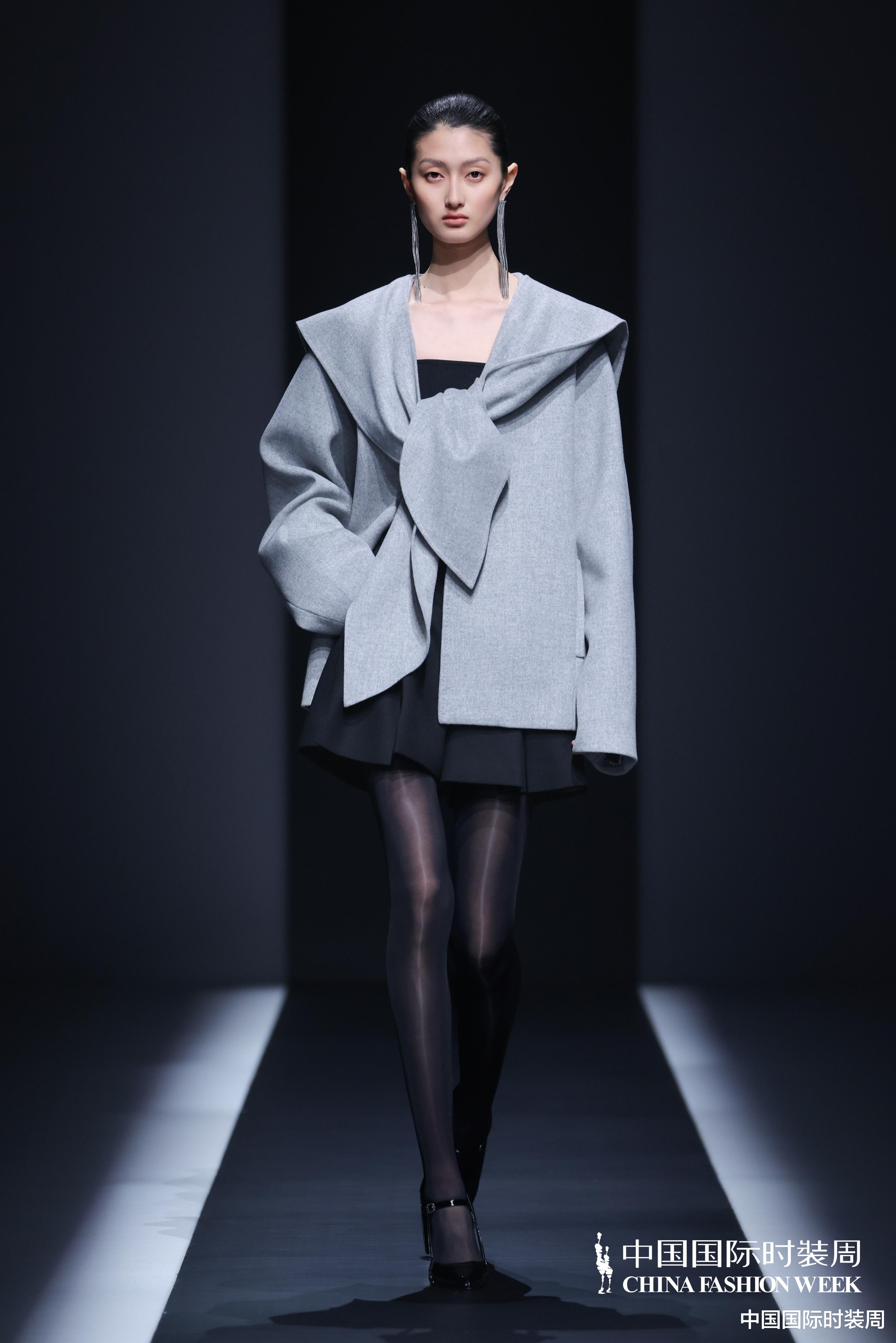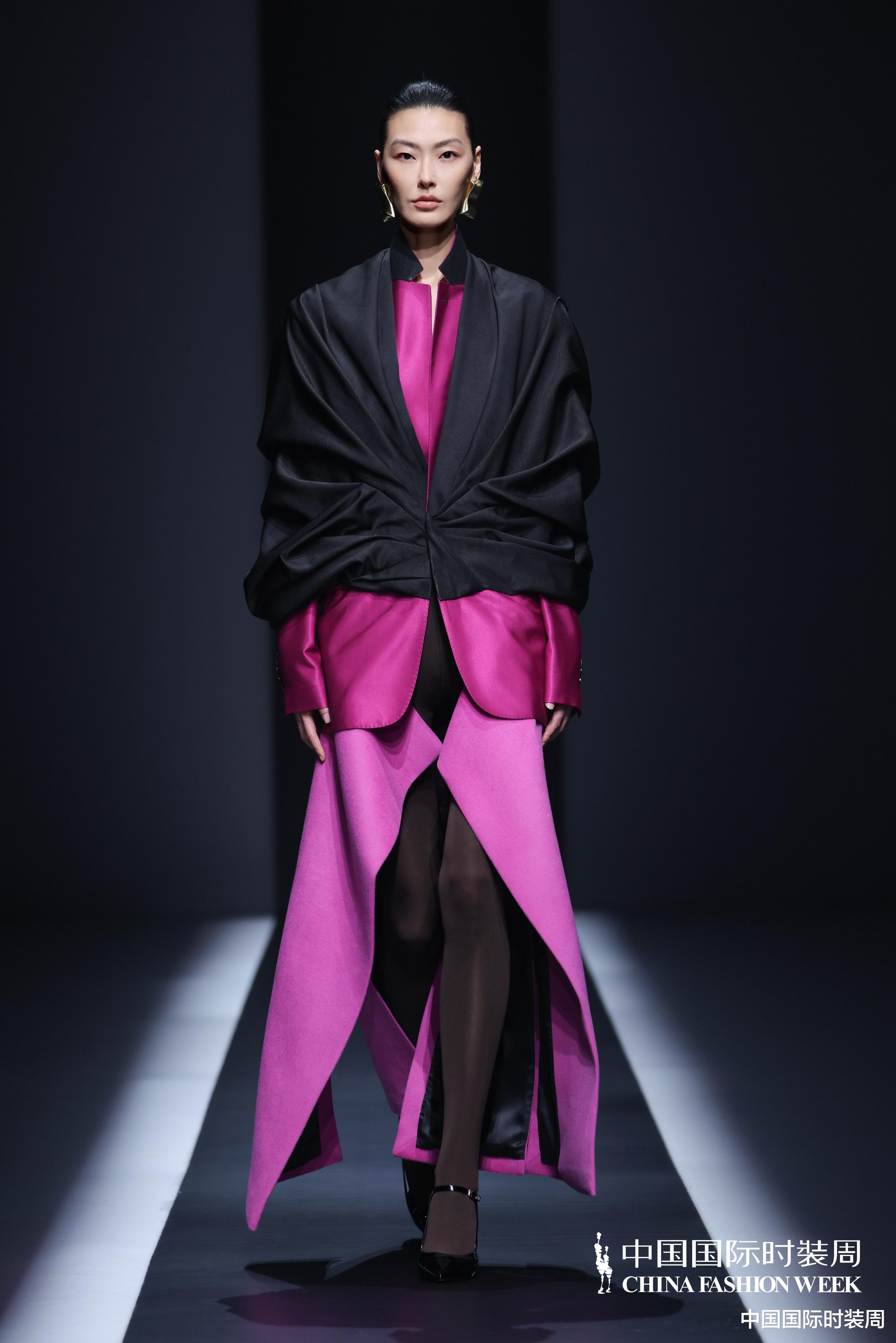 秀场之上,灯光渐亮、旋律奏响,模特身着玫粉色长款大衣,搭配压褶工艺打造的白色花瓣裙优雅登场,将“我”对世界最初的懵懂感知,悄然藏于衣物肌理之中;随着旋律鼓点逐渐加重,象征着成长历程的推进,服装色彩从明艳热烈的玫粉,渐变为低调内敛的炭灰、中灰与浅灰蓝。颈部缠绕的线条、肩部利落的轮廓、胯部扩张的结构、衣身斜向交错的剪裁,生动勾勒出成长路上和谐与冲突共生的状态;最终,以克制沉稳的酒红色调、舒展自在的服装造型,呈现出当下“我”对世界的成熟理解与全新感知。此外,设计师宋双以独特的设计语言,重新演绎16世纪拉夫领与中世纪欧洲裙撑经典元素,融合建筑美学结构特点,打造出极具空气感的造型,成为秀场一大亮点。
