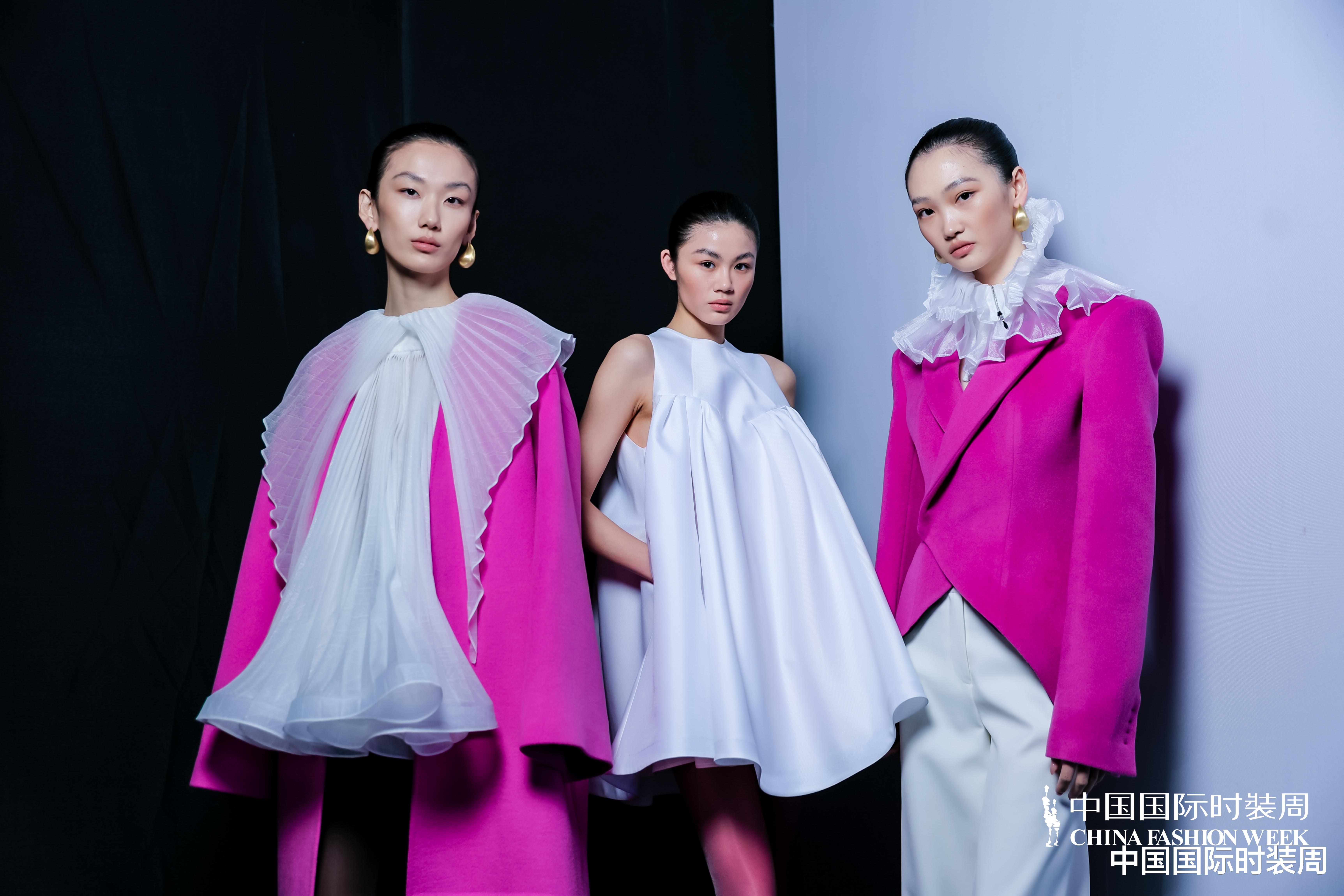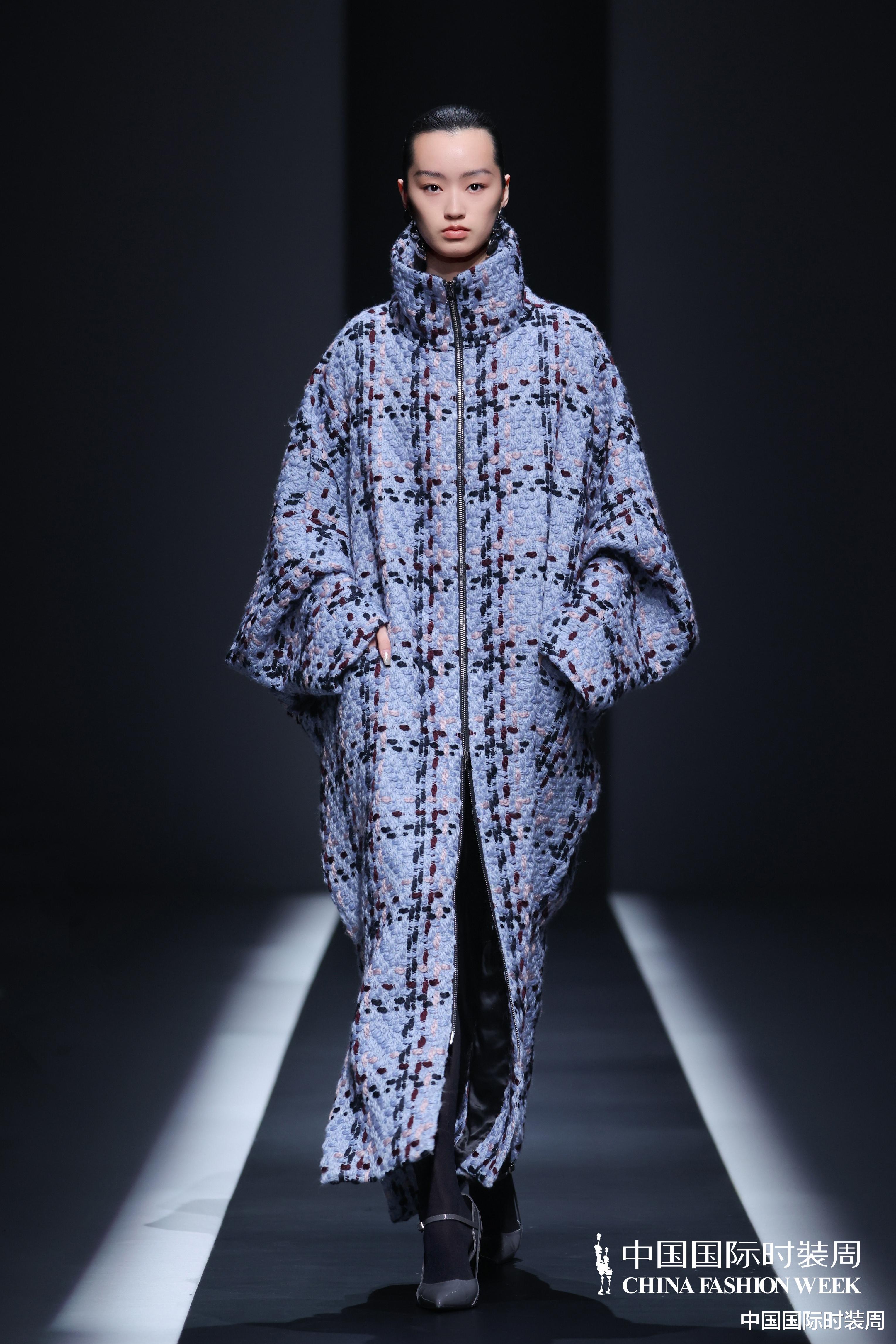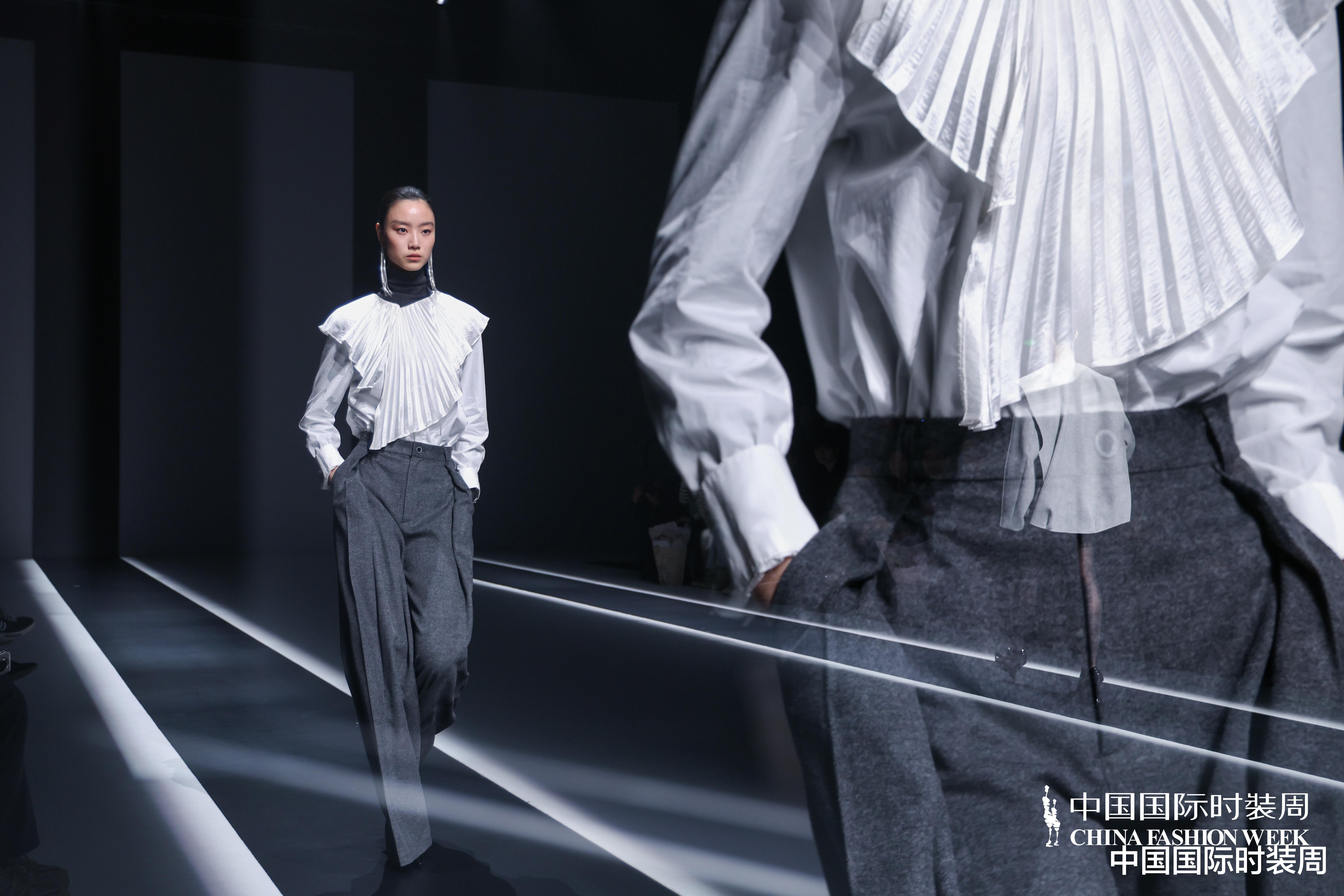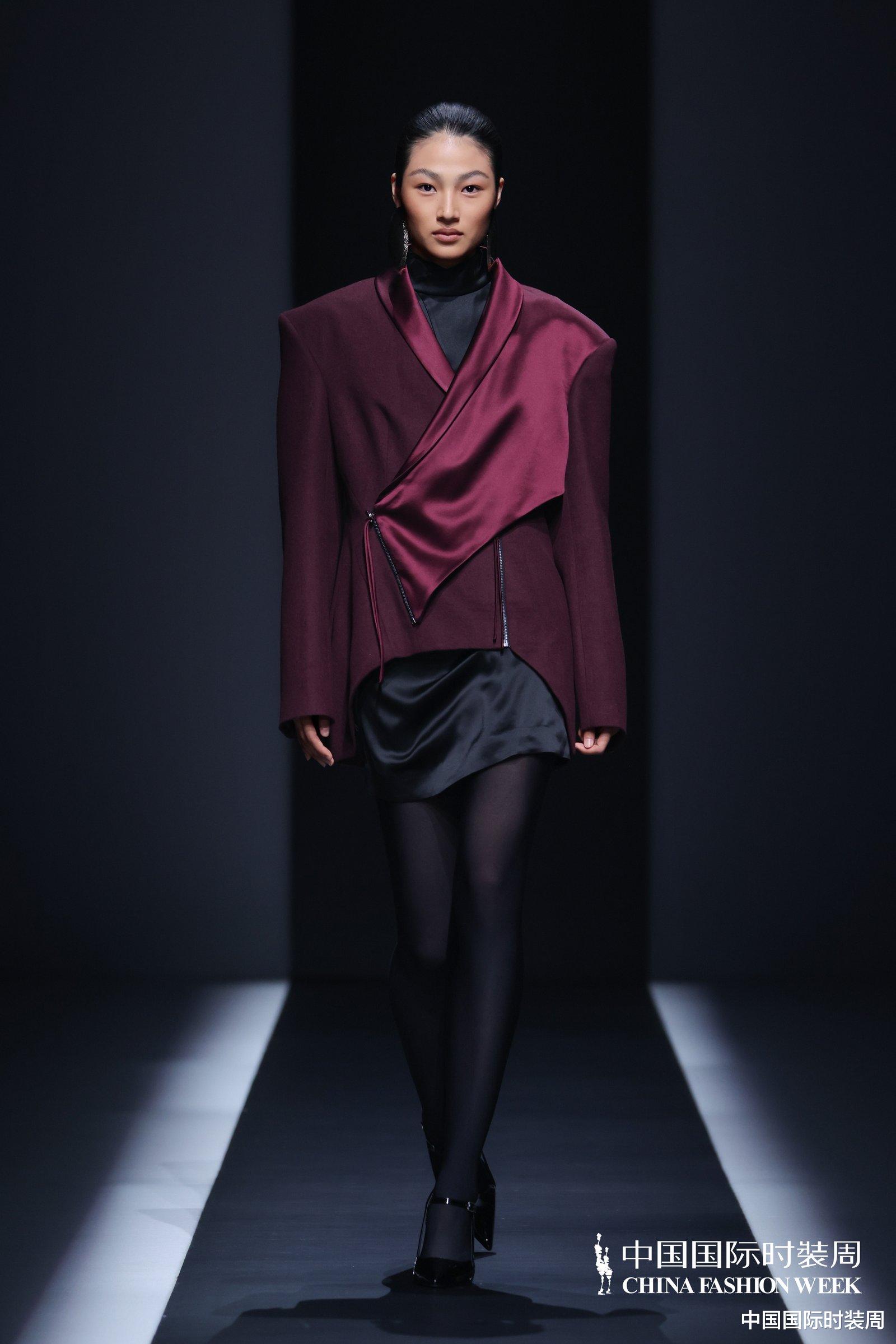 秀场之上,灯光渐亮、旋律奏响,模特身着玫粉色长款大衣,搭配压褶工艺打造的白色花瓣裙优雅登场,将“我”对世界最初的懵懂感知,悄然藏于衣物肌理之中;随着旋律鼓点逐渐加重,象征着成长历程的推进,服装色彩从明艳热烈的玫粉,渐变为低调内敛的炭灰、中灰与浅灰蓝。颈部缠绕的线条、肩部利落的轮廓、胯部扩张的结构、衣身斜向交错的剪裁,生动勾勒出成长路上和谐与冲突共生的状态;最终,以克制沉稳的酒红色调、舒展自在的服装造型,呈现出当下“我”对世界的成熟理解与全新感知。此外,设计师宋双以独特的设计语言,重新演绎16世纪拉夫领与中世纪欧洲裙撑经典元素,融合建筑美学结构特点,打造出极具空气感的造型,成为秀场一大亮点。
