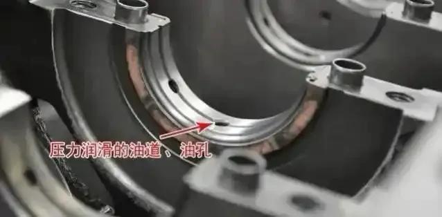 轴瓦的摩擦系数为何更小?如上图所示轴瓦上布置着注油孔、油道,运行时机油会被高压顺着油孔注入油道,最终凭借高压机油在曲轴与轴瓦之间进行填充并形成一层油膜,分离开轴瓦与曲轴。这就是工业生产与制造中常见的压力润滑。汽车发动机轴瓦属于静压轴承(若对动压轴承感兴趣的朋友可以自己搜搜、学习)。