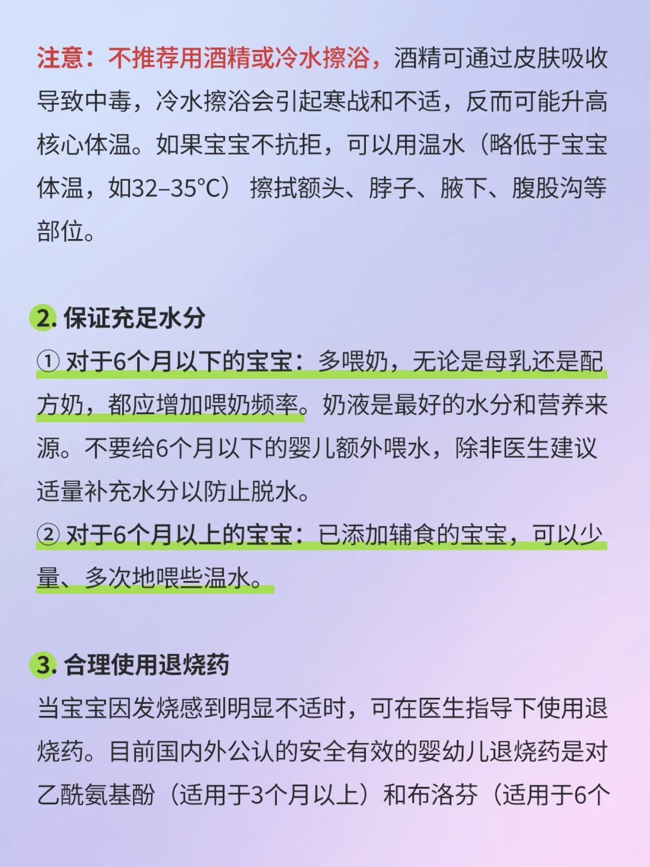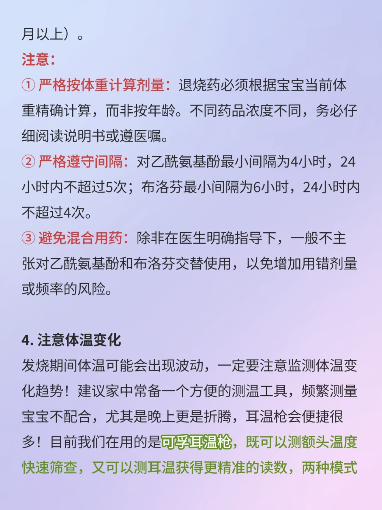合理用药,别盲目自行处理,有些爸妈一看到宝宝发烧,就赶紧翻出家里的退烧药,也不管适不适合宝宝,就给宝宝吃。这可是大错特错!不同年龄段、不同体重的宝宝,用药剂量都不一样,而且不是所有退烧药都适合宝宝。一般来说,3个月以下的宝宝发烧,不建议自行用药,要赶紧送医院;3个月以上的宝宝,体温超过38.5℃,可以在医生指导下使用退烧药,比如对乙酰氨基酚或布洛芬。用药的时候一定要严格按照说明书上的剂量来,可别觉得多吃一点能好得快,过量用药可能会对宝宝的肝脏、肾脏等器官造成损害。还有,不要同时给宝宝用两种退烧药,以免药物相互作用产生不良反应。
