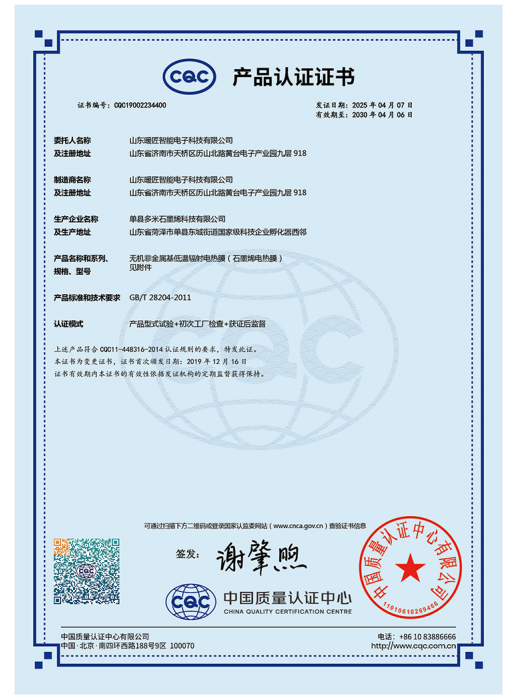 产品质量是企业的生命线。公司通过GB/T9001质量体系认证、ISO14001:2004环境管理体系认证及OHSAS18001职业健康安全管理体系认证,建立了严格的质量管控流程。公司生产的石墨烯电热膜通过了中国质量认证中心CQC认证、SGS的ROHS认证、俄罗斯EAC认证和欧洲CE认证,产品质量达到国际先进水平。