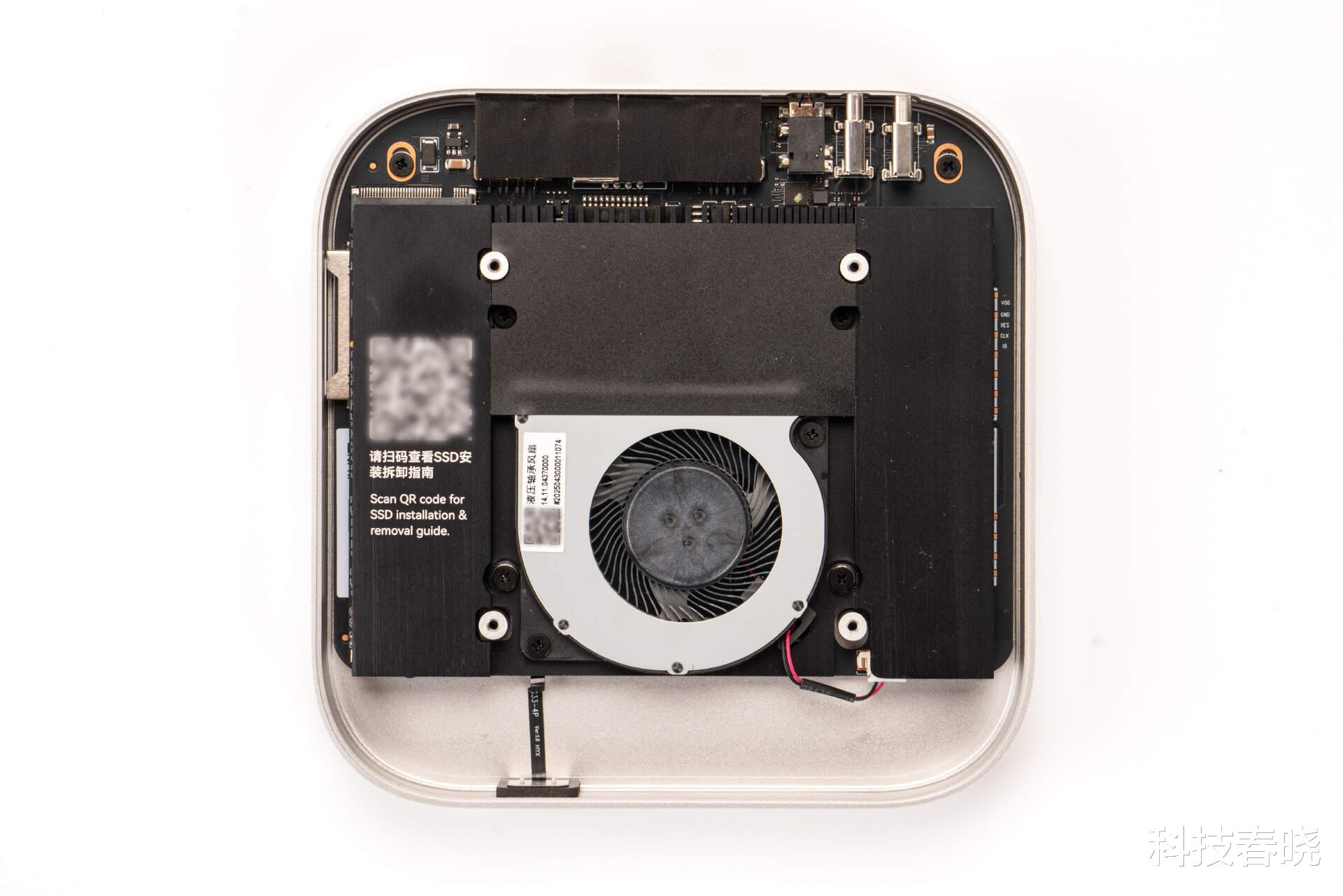 像零刻Matemini这种有主动散热的Thunderbolt5扩展坞,需要先拆下底部的盖板和MSC散热风扇支架,就可以看到M2的扩展槽位,45度斜着插入硬盘再锁紧螺丝即可。
