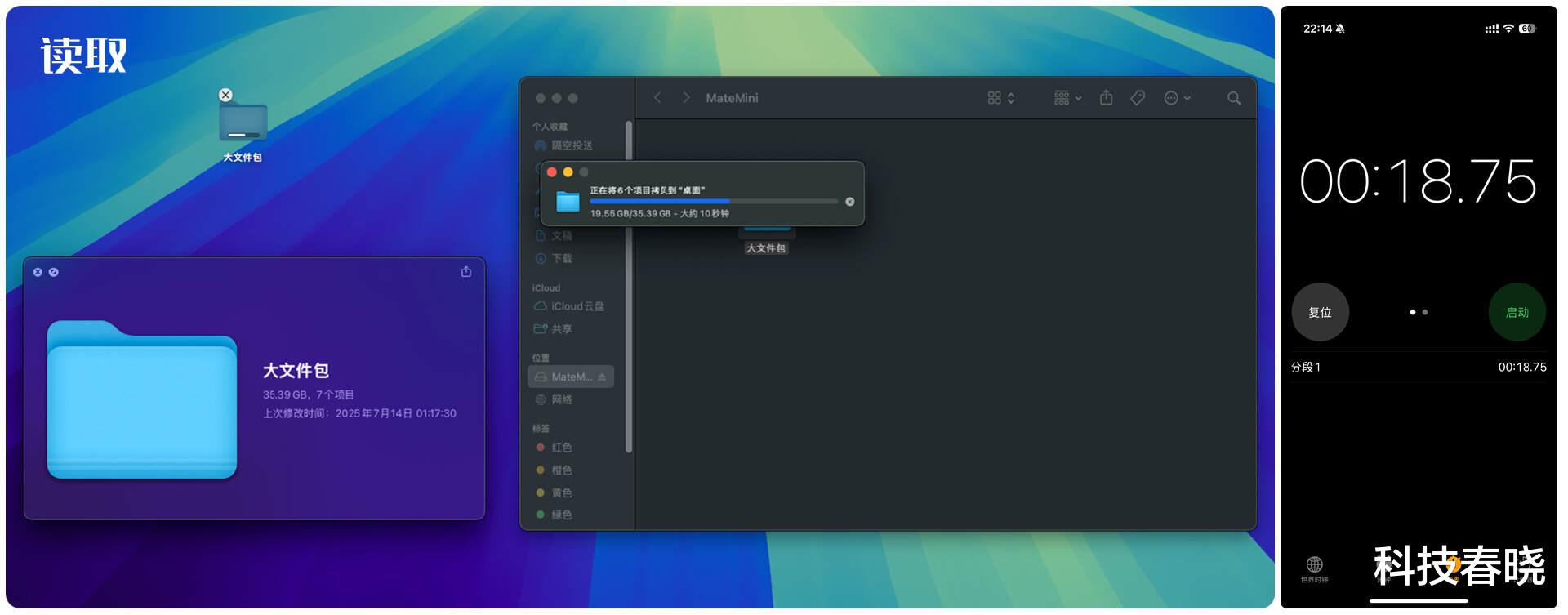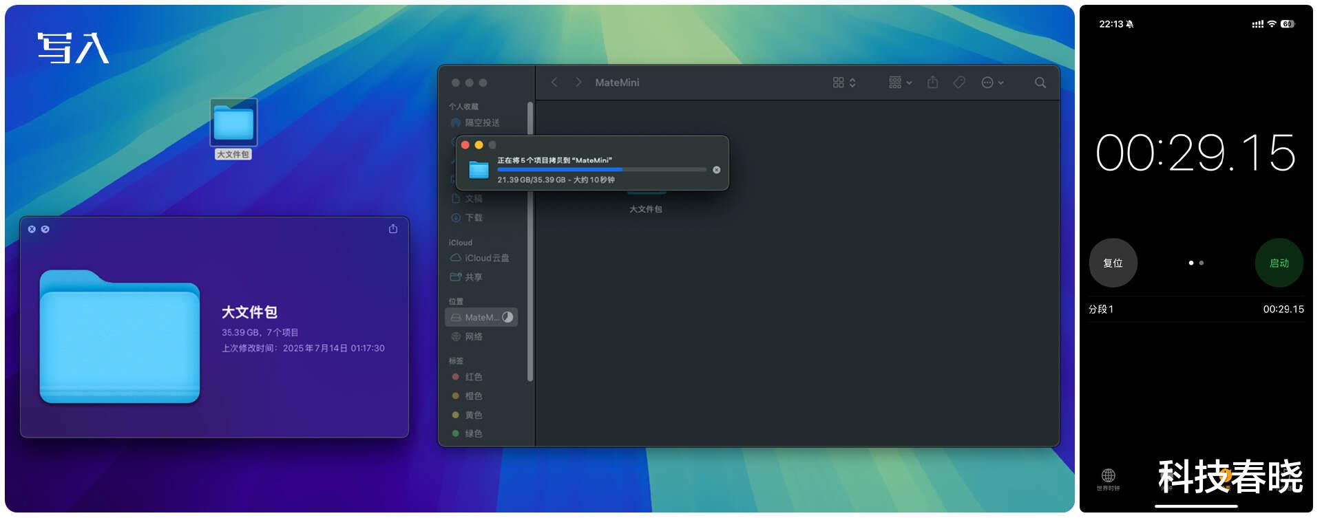这里我还拿来了一个4K剪辑序列的文件包,大小为35.39G,实际测试了拷贝和写入这两个场景,用时分别是18.75s和29.15s,大家觉得怎么样?在大文件传输效率这方面,我确实觉得足够用。