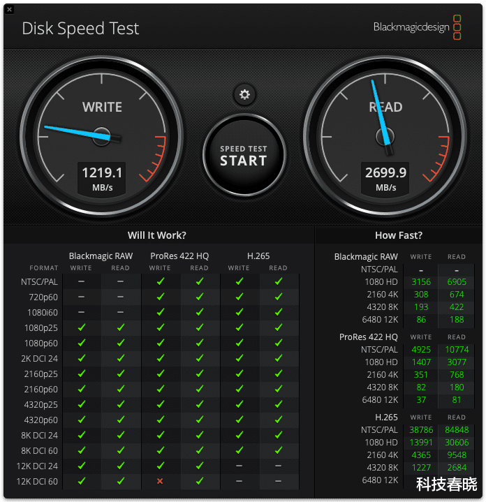 接着是Disk Speed Test,这应该是MacOS玩家最熟悉的硬盘测速软件了,可以很方便的观察 硬盘性能可否满足对非线性视频编辑的要求,比如ProRes 422 HQ、Cinema DNG RAW和10 Bit 422格式的实时编辑,所以下方有不同分辨率和帧率的组合列表,有绿色对号勾选就表示能够满足。