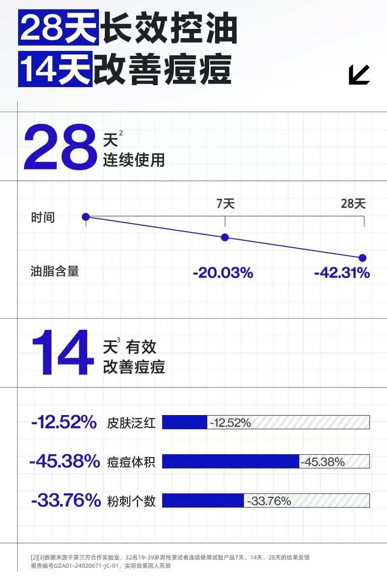 祛痘板块中,专利超分子水杨酸是“毛孔清道夫”,凭借强渗透性温和代谢老废角质、疏通堵塞毛孔,搭配独特反重力悬浮工艺,让活性成分均匀分布,每次使用都能稳定发挥祛痘力,14天可使痘痘体积锐减45.38%,同时改善皮肤泛红、减少粉刺,第三方实验显示,超93%受试者认同其改善痘痘红肿、减少粉刺的效果,96.88%认同淡化红色痘印,控油祛痘的口碑实力尽显。