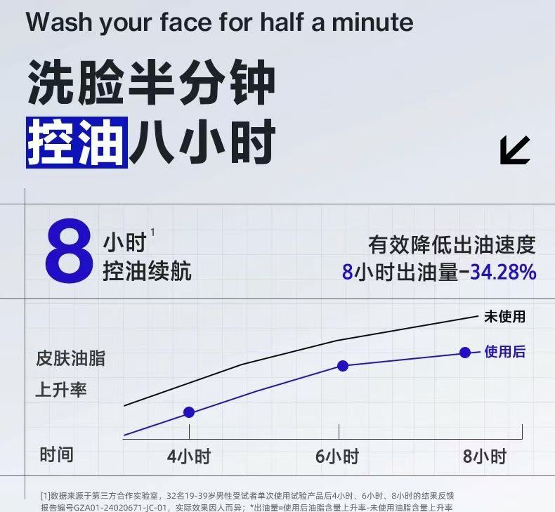 控油时长:通过仪器记录洁面后 2 小时、4 小时、8 小时的皮肤油脂分泌量变化。