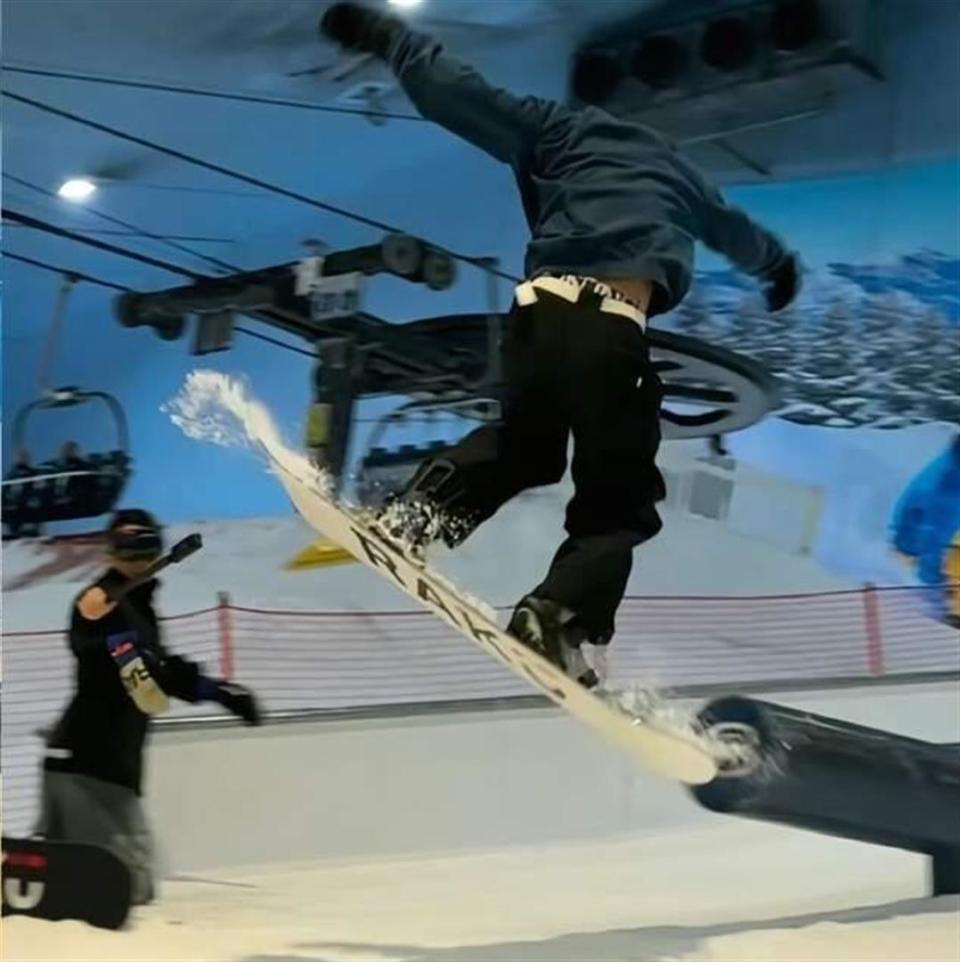 他这次来深圳滑雪,看样子技术已经挺熟练了。想想也是,有个那么会滑的爹亲自教,想学不好都难。