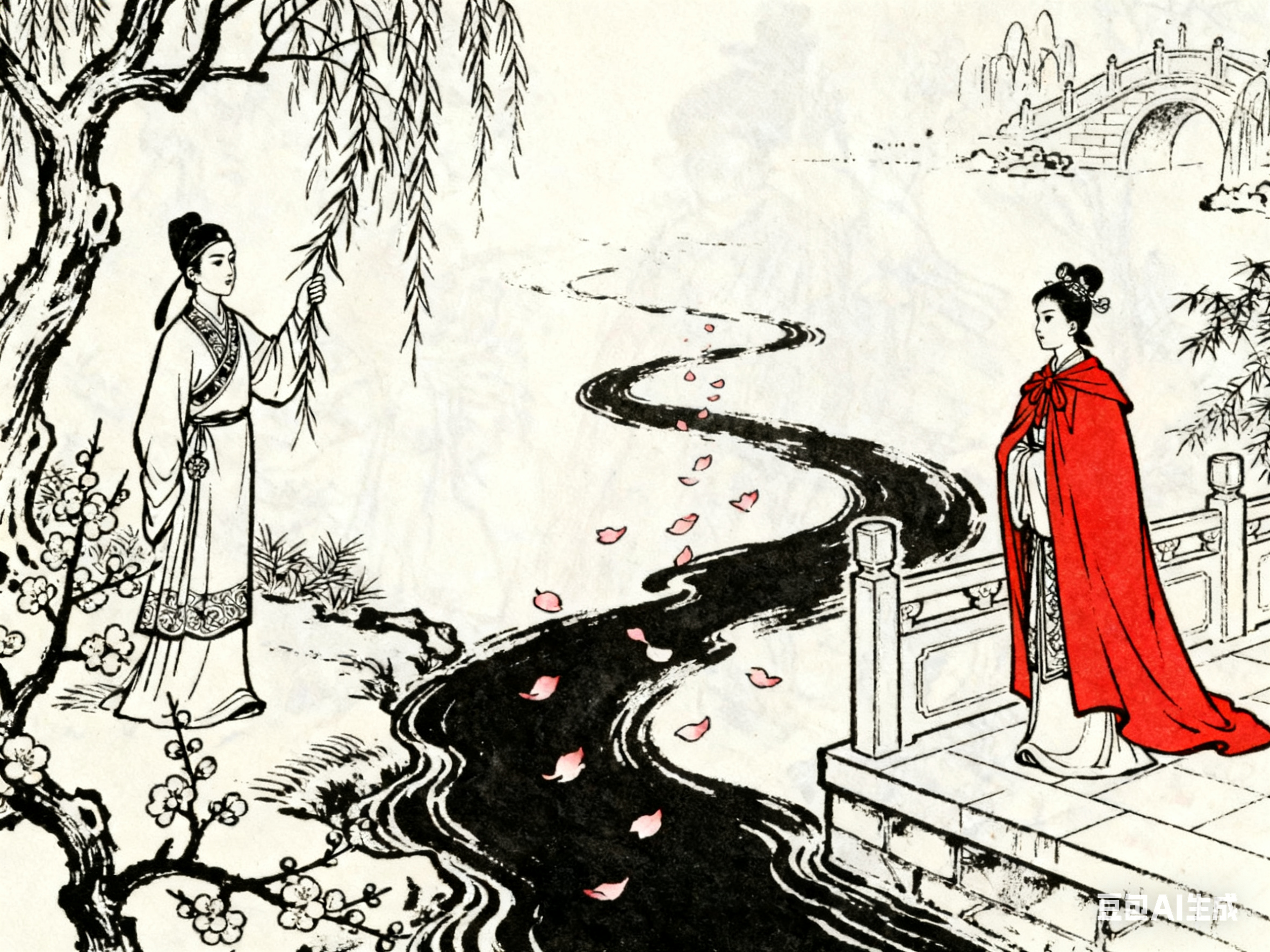 这种对 “情” 的珍视,被《红楼梦》完整继承,且推向更复杂的 “世情” 维度。曹雪芹笔下的 “情”,不再是杜丽娘式的单一觉醒,而是融入家族兴衰、人性善恶的立体叙事。林黛玉葬花时吟 “花谢花飞飞满天,红消香断有谁怜”,她的 “情” 不只是对宝玉的爱慕,更是对自身命运、对所有美好事物消逝的悲悯。宝玉摔玉喊 “这个妹妹我曾见过的”,不是简单的一见钟情,而是对 “木石前盟” 宿命感的共情。
