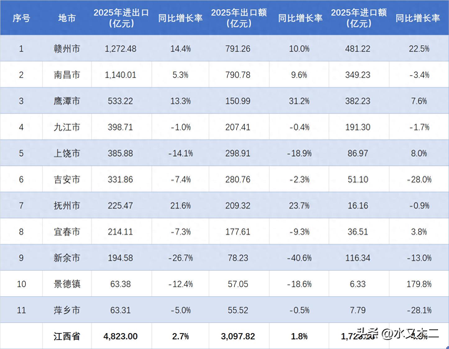 景德镇市和萍乡市进出口贸易规模与其他地市差距较大,2025年全年金额均在百亿之下,分别只有63.38亿元和63.31亿元,排在了全省最后两位。两地不仅总量最小,同比也都出现了下滑之势,降幅分别为12.4%和5.0%,接下来若没有更好表现,势必被前面地市进一步拉开距离,还需倍加努力才行。