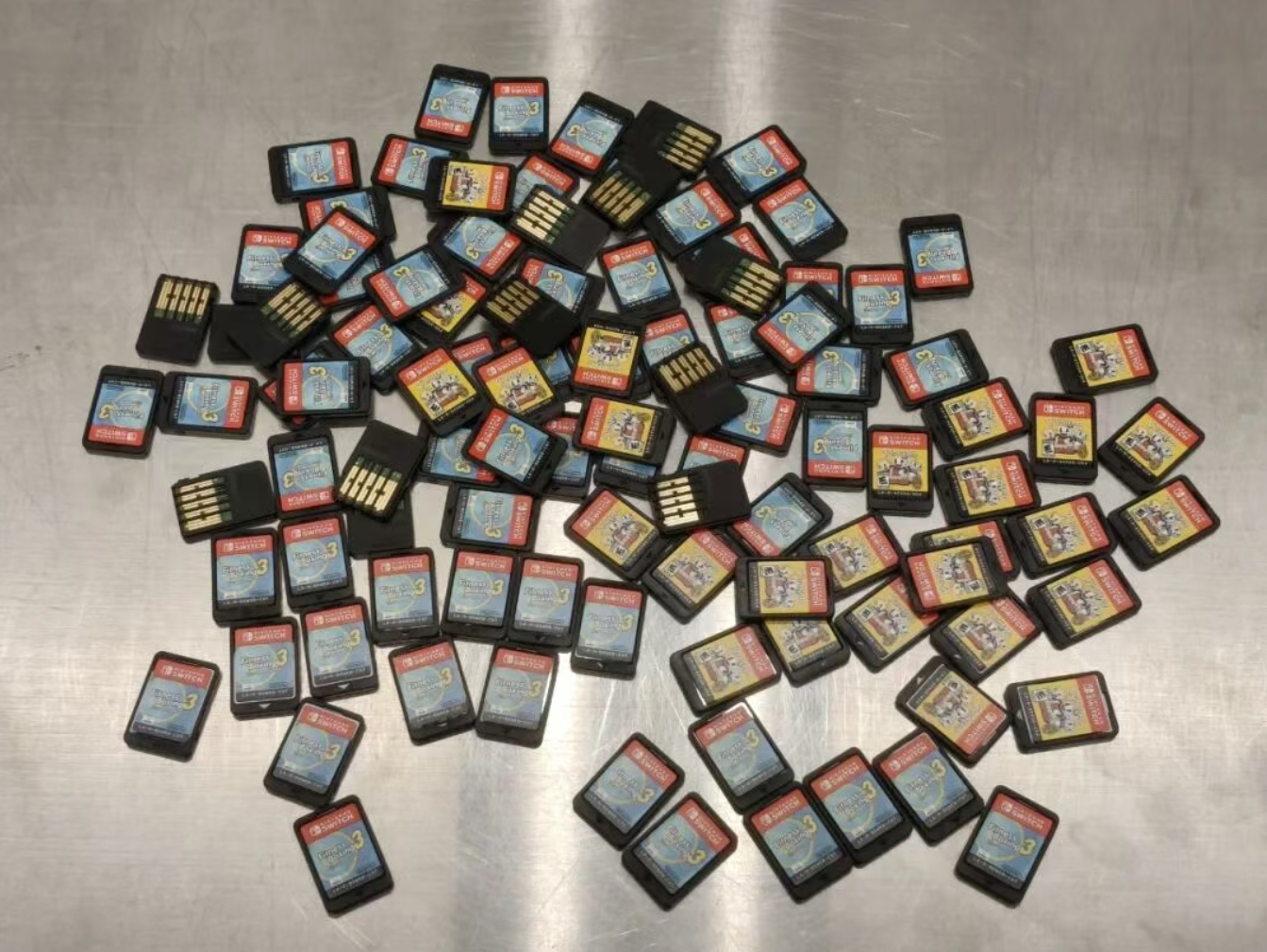 海关关员随即对其进行拦截检查,在该旅客的左、右小腿处分别查获用透明保鲜膜缠绕固定的SWITCH游戏卡60张、45张。