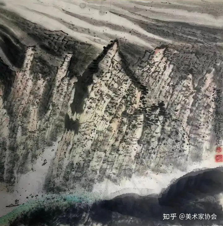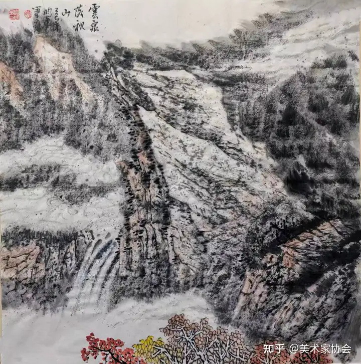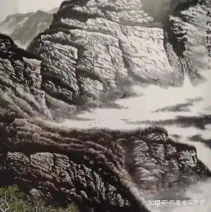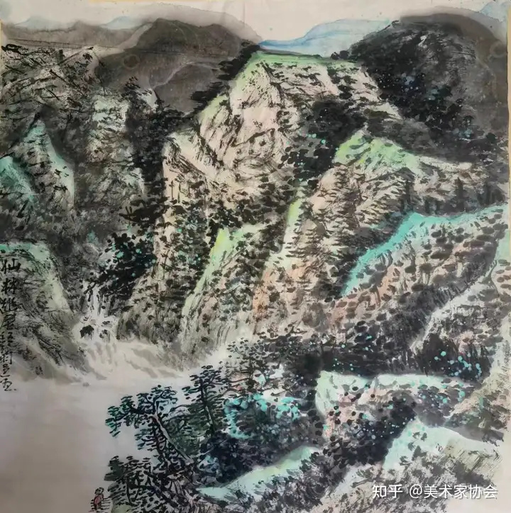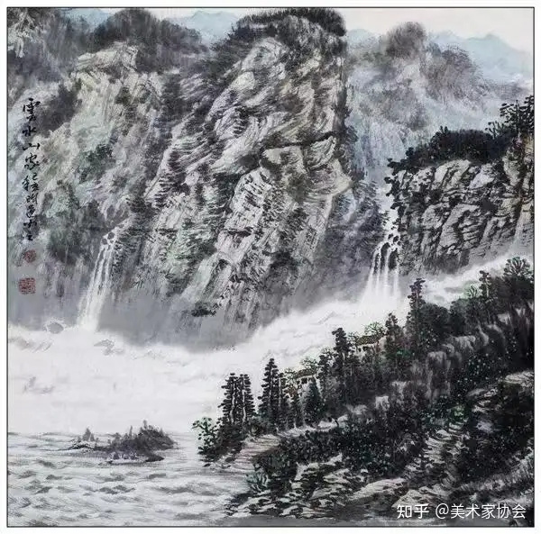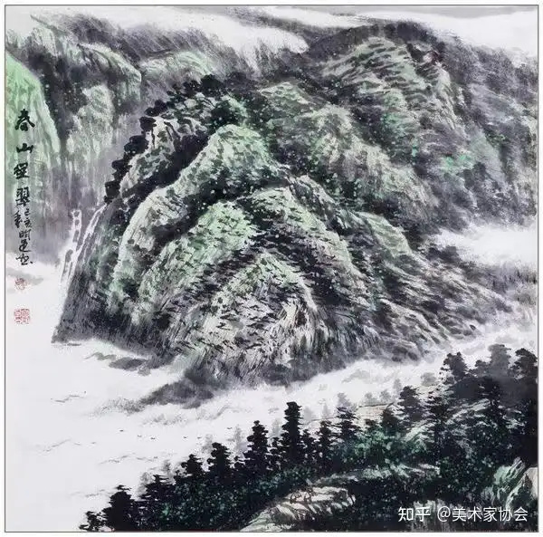 他的笔墨语言,具有一种震撼人心的力量。在构图上,他善于运用极具张力的对角线与龙脉盘曲之法,使峰峦起伏、山势蜿蜒,既展现出自然的磅礴伟力,又蕴含着严谨的结构美感。在用笔上,他骨法用笔,力透纸背,山石的皴擦点染,无不透出金石之气,苍劲而古拙。在用墨上,他更是达到了“墨气淋漓幛犹湿”的境界,通过焦、浓、重、淡、清的层层积染,营造出烟云变幻、气象万千的视觉奇观。他的画面中,山是大地的脊梁,水是岁月的脉搏,一草一木皆被赋予了生命的律动,仿佛在无声地诉说着宇宙的洪荒与历史的沧桑。