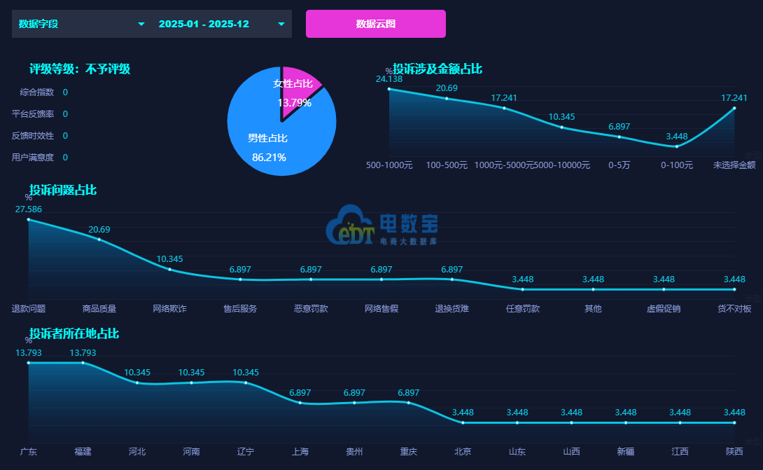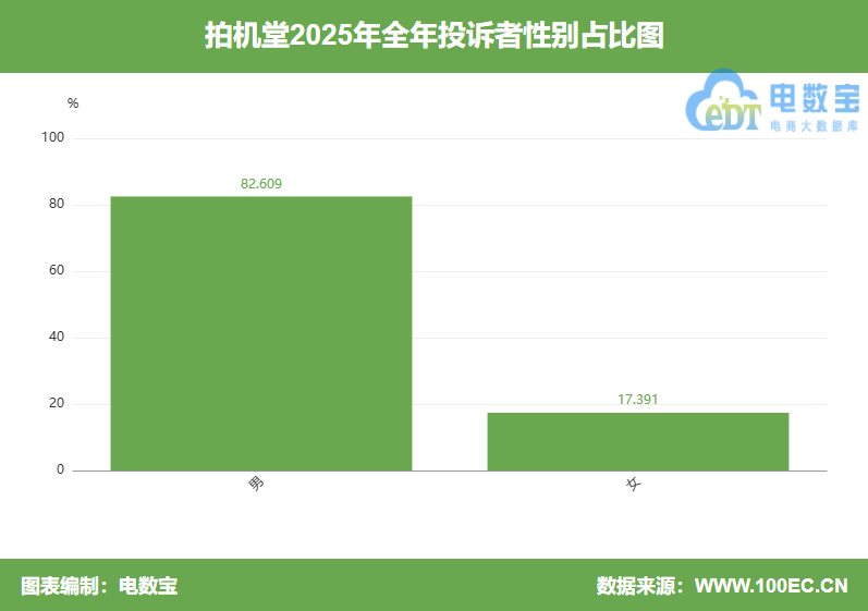 根据网经社旗下电商大数据库“电数宝”显示,投诉“拍机堂”男性用户投诉比例为82.609%,女性用户投诉比例为17.391%。