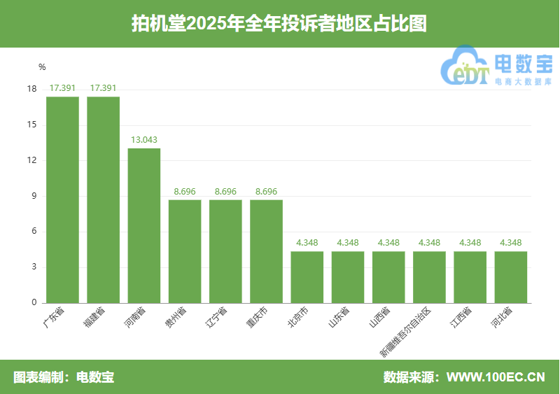 根据网经社旗下电商大数据库“电数宝”显示,2025年投诉“拍机堂”的用户主要集中地区为广东省(12.000%)、福建省(12.000%)、河南省(12.000%),其于分别为:贵州省、辽宁省、重庆市、北京市、山东省、山西省、江西省、河北省等。