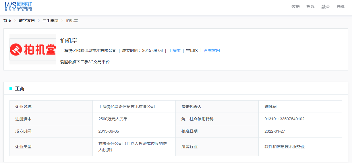 据网经社企业库显示,拍机堂隶属于上海悦亿网络信息技术有限公司,成立于2015年9月6日,法定代表人为陈逸轲。