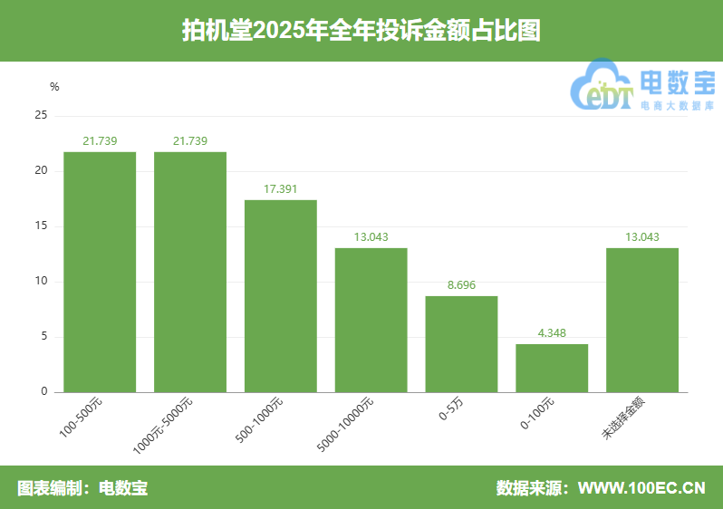 用户投诉“拍机堂”的消费金额主要在100-500元、1000-5000元、500-1000元、5000-10000元、0-5万、0-100元、未选择金额区间。
