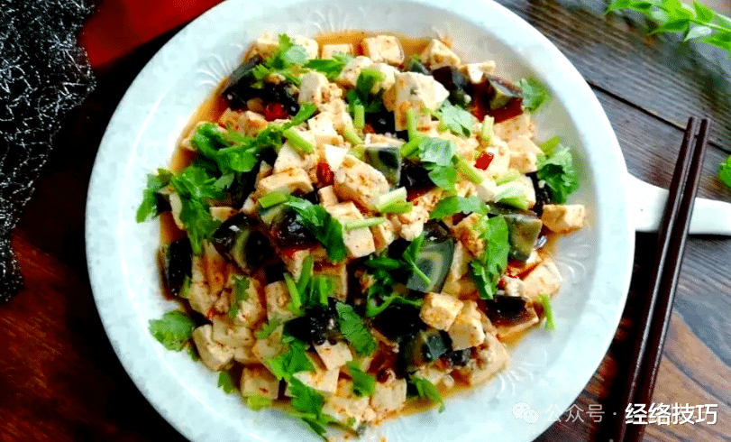 香菜拌核桃皮蛋豆腐:把内酯豆腐切块放到盘子里,把皮蛋切碎摆在上面,用一点点香油、盐、香醋调制成的汁浇上去,最后撒上香菜末还有一点炒香的核桃碎。豆腐、皮蛋性质偏凉,搭上这么一大把温性的香菜,既平衡了凉性,又借着香菜的劲开了胃、通了阳气,味道也更有层次。适宜冬季室内干燥、稍微有点虚火但是又体寒的人,口感较为清爽。