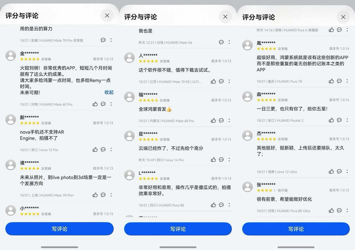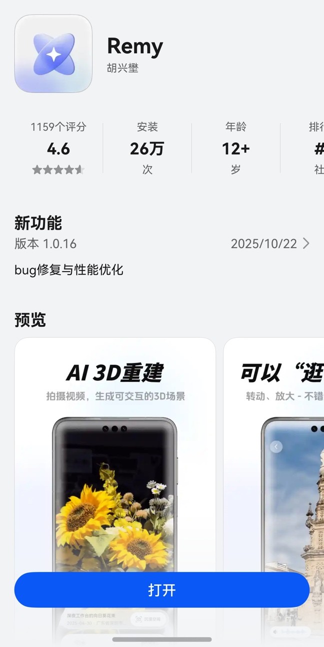 在Remy的应用市场主页上,许多用户涌入评论区分享使用体验,普遍反映应用带来的3D影像功能既新奇又实用。有不少人提到,应用生成的3D影像不仅清晰度高、成片速度快,而且还能生成视频分享给他人,为社交分享增添了更多乐趣。这种体验上的突破,显然得益于鸿蒙生态的独家优化,使得3D重建速度更快、效果更稳定。