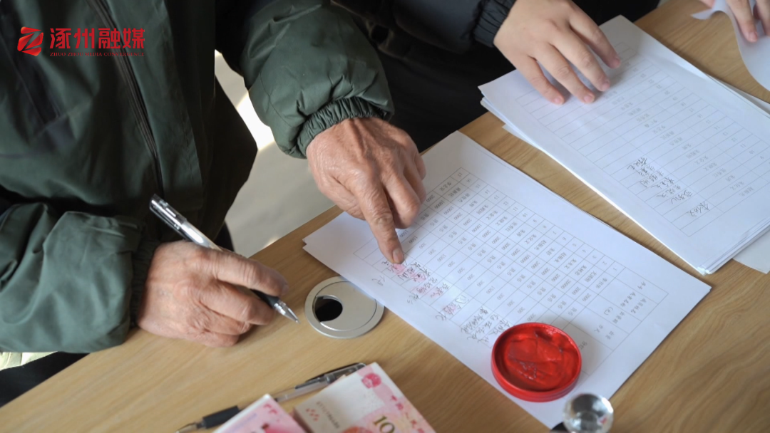 会议室内喜气洋洋,桌上现金整齐码放,乡亲们面带笑意等候,签字、按印、领钱,每一个动作都饱含对美好生活的期盼。