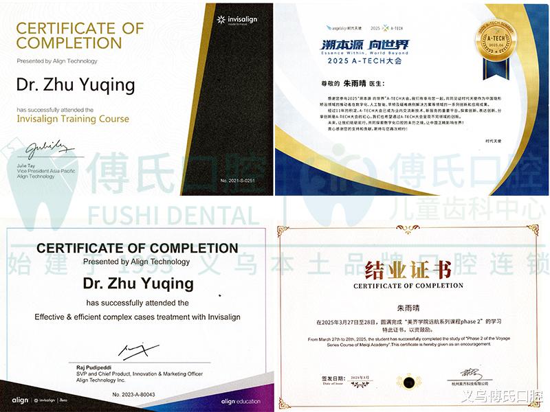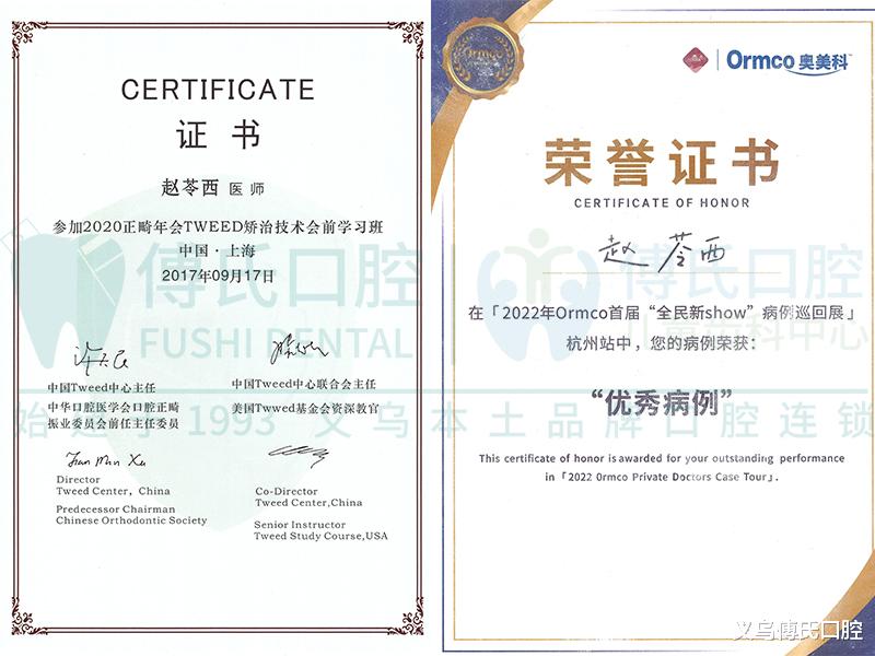 2、专项技术认证(种植/正畸必备):种植、正畸属于高难度诊疗项目,主诊医生需拥有对应品牌种植系统认证、正畸学会认证(如隐适美、时代天使认证),义乌傅氏口腔种植、正畸医生均持有多项国际专项认证,临床经验丰富。