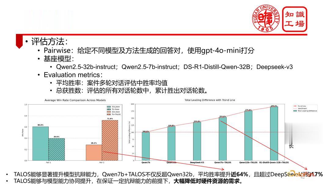 评估结果显示,基于传统模型构建的 Agent 能有效的提升基础模型的抗辩能力。以 Qwen7b、Qwen32b-instruct 和 Deepseek V3 为例,其平均胜率提升幅度接近 64%。