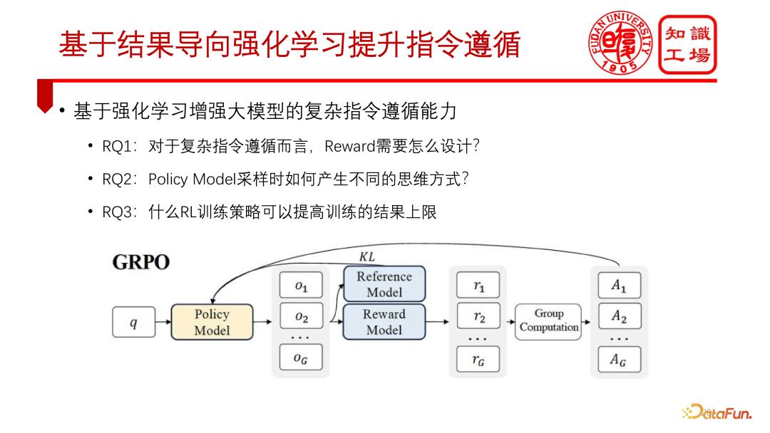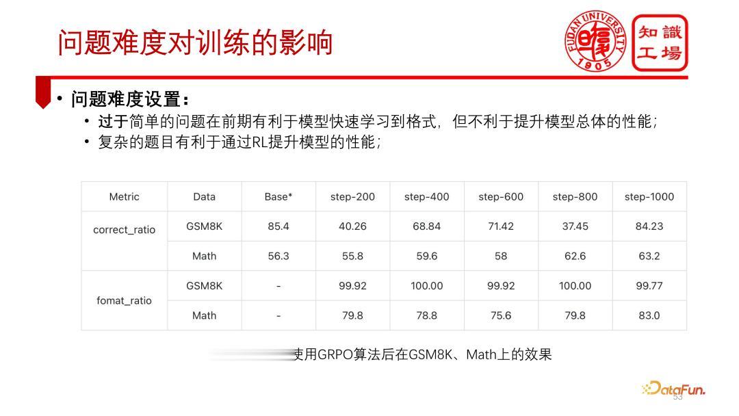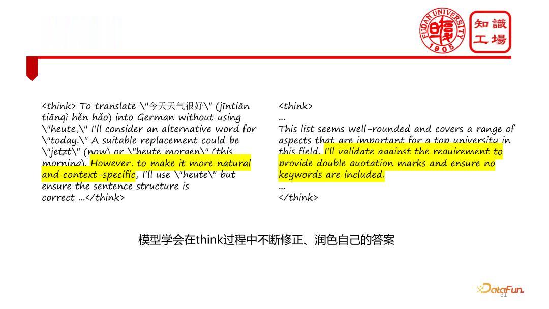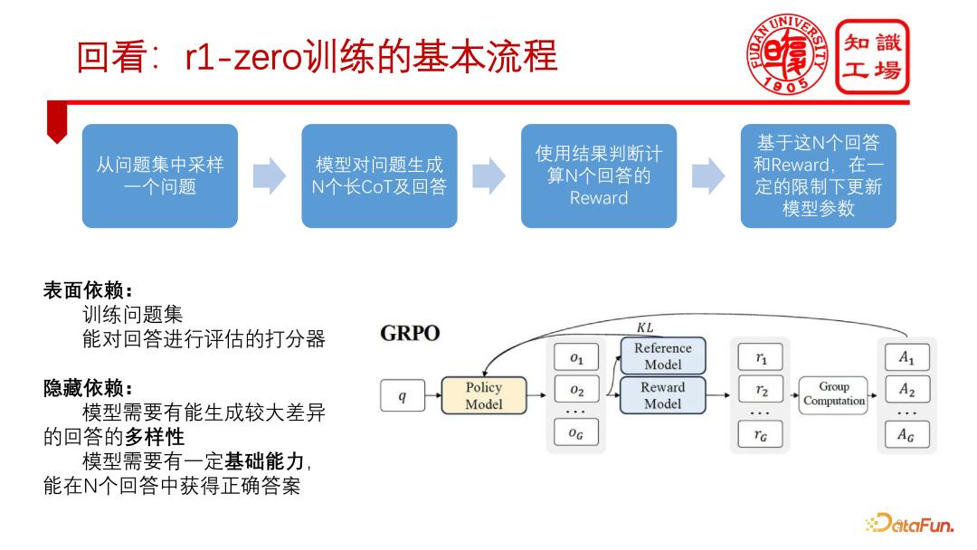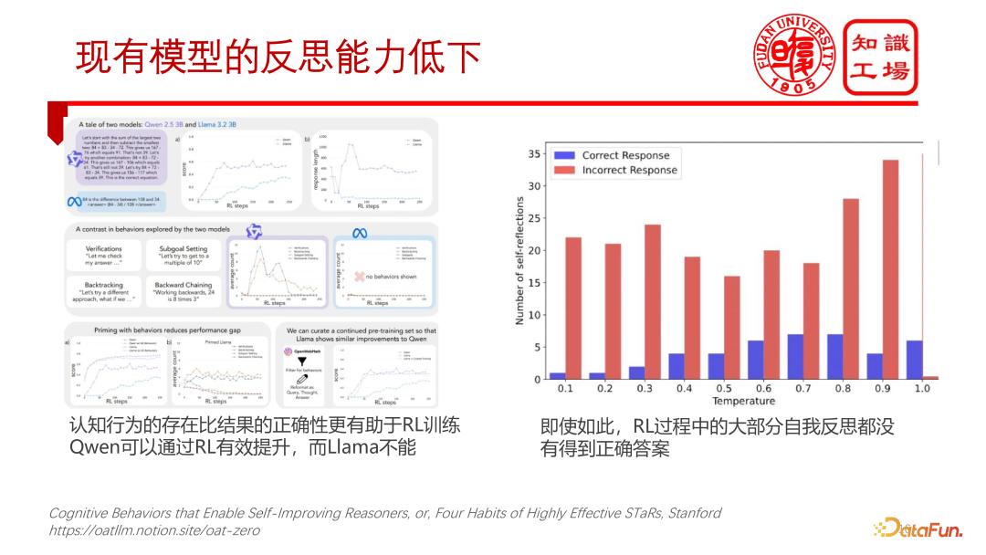 上面图中左侧是斯坦福近期的一项研究,是为了解答一个疑问:为什么我们现在很多 GRPO 复现工作中,发现了 Qwen 模型的 GRPO 复现效果较好,而 LLaMA 的表现却较差?研究结果表明,Qwen 的基础模型本身就具备某些与反思相关的能力或特性,而 LLaMA 并不具备。我们的 GRPO 训练数据完全来自模型自我探索,若模型本身不具备这种能力,自然难以在 RL 中获得显著提升。
