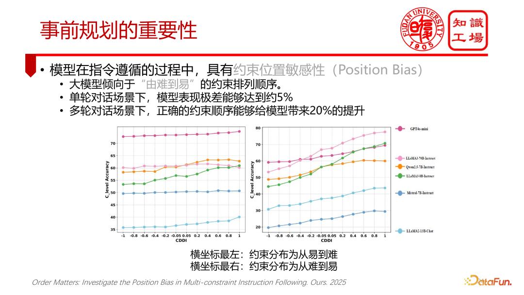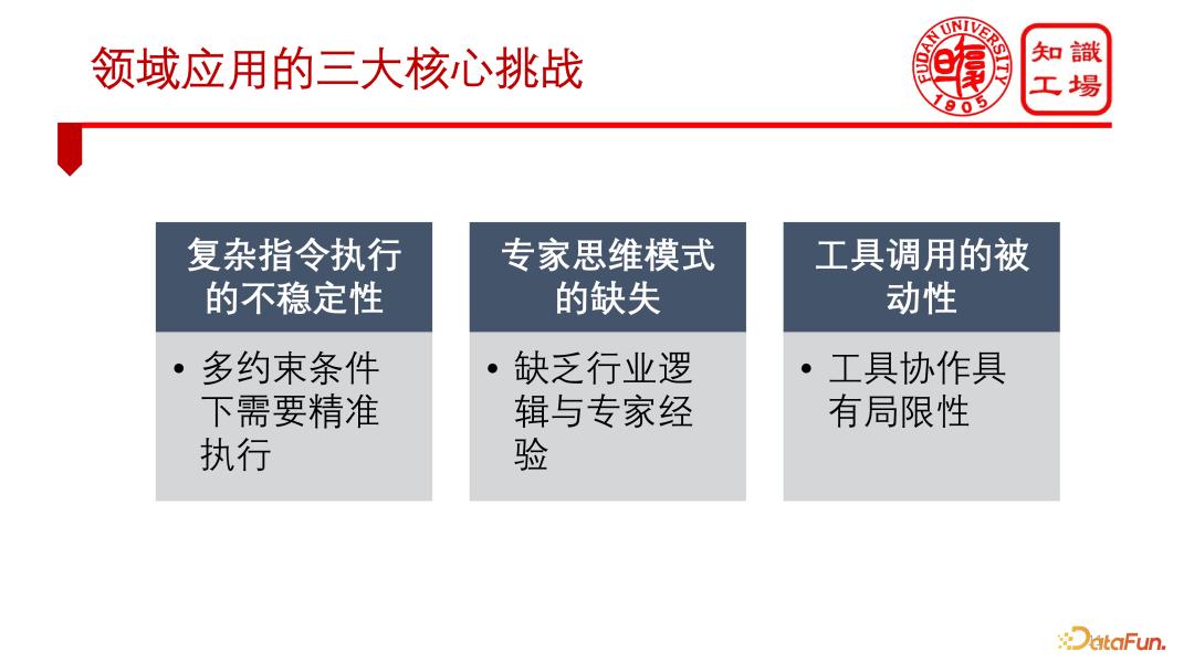复杂指令执行的不稳定性问题。什么是复杂指令?举例来说,当我们直接向大模型提问时(如在手机豆包或 DeepSeek 中输入问题),通常只需简短的七八个字即可。然而在实际工作场景中,例如老板要求制作研究报告或表格,或是编写 Agent 的 prompt 时,这些指令往往特别冗长——既包含大量背景材料,又涉及诸多具体要求与约束(如"要怎样做""不要怎样做",以及"输出需采用 JSON 格式"等要求)。这种情况下,大模型经常因未能严格遵循指令而导致整个解析过程失败。专家思维模式的缺失问题。以 AlphaGo(阿尔法围棋)为例,它已超越人类水平并摒弃了所有人类棋谱。但在大多数行业应用中,当前的大模型尚无法像围棋AI那样完全超越人类专家经验。特别是在某些安全相关领域,系统必须严格遵循专家思维模式,而非自由发挥。工具调用的必要性。在行业应用中,大模型往往不能仅通过语言交互完成任务,而必须调用领域内的专业工具才能实现预期效果。1. 挑战 1:复杂指令的精准执行
