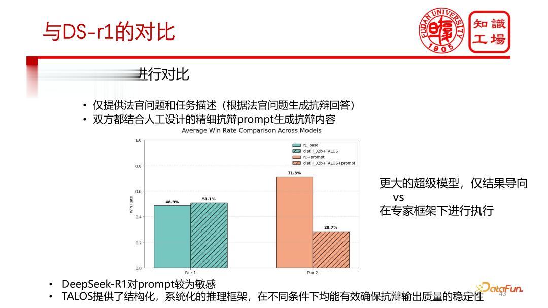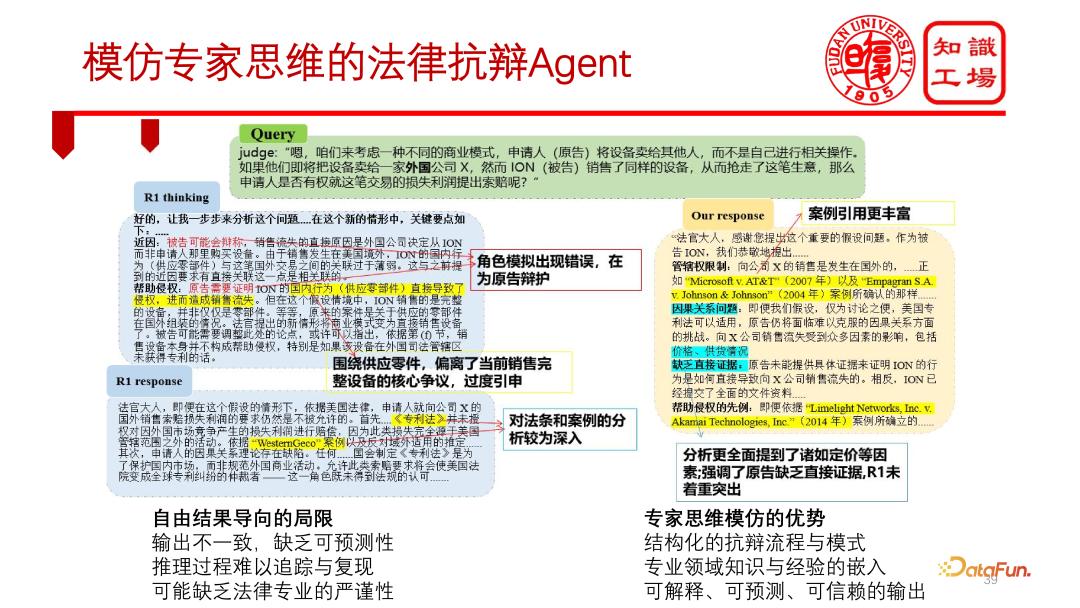 以法律领域为例:当要求大模型扮演律师进行法庭抗辩时(类似辩论赛形式),深度思维模型如 DeepSeek-R1 能够胜任这一任务——它会分析怎么样去辩论并提供多种辩论结果。另一种做法是模仿特定律所或律师的既有辩论策略。这两种方式各具优劣:自由结果导向的辩论方式可能过于随意;而行业内的专业律所往往要求遵循固定辩论模式,这样即便失败也不需承担责任。