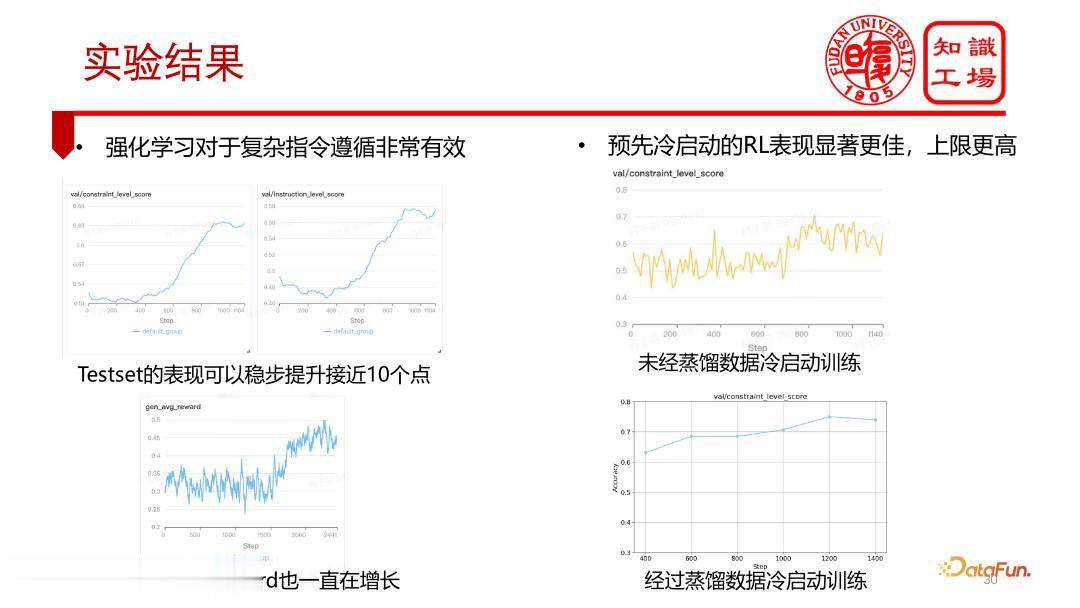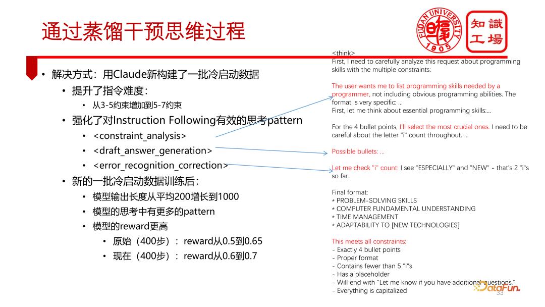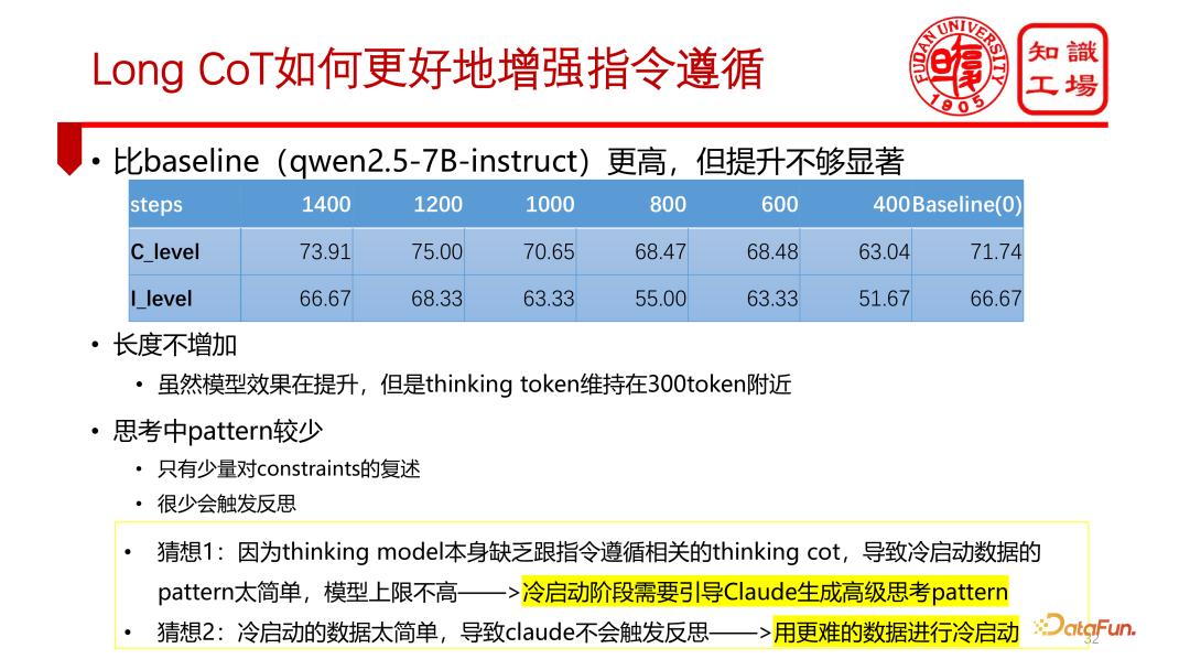 模型在指令遵循效果上获得进一步提升输出长度显著增加(从平均 200 增长至 1000)生成的思考内容中包含更多符合设计预期的模式这个工作证明了针对特定任务需求及其相关思维方式,我们需要预先将其注入模型,而不能完全依赖模型自主探索可能的思维方式。
