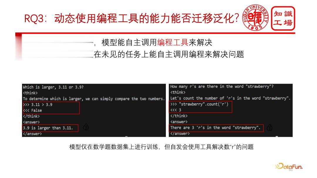 数值比较:9.11 和 9.9 哪个大?3.11 和 3.9 哪个大?字符统计:strawberry 包含几个字母?需要强调一点,该模型仅在 GS8K 和 LS 数学数据集上进行训练,从未接触过类似编程场景的训练数据,却能够自发泛化出来,实现了通过工具调用解决这类问题的能力。