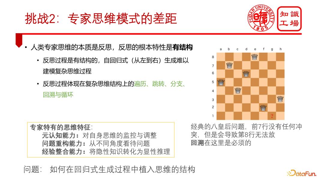 第二个挑战是专家思维模式的差距。这里我仅以计算机领域的经典的八皇后问题为例,这是一个基础算法问题,它关键在于必须通过回溯算法才能解决。