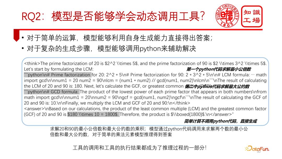 我们来看一个更复杂的数学题示例。在这个案例中,模型先后调用了两次 Python 解释器:第一次获取最小公倍数,第二次同样用于最小公倍数计算,第三次遇到 180×10 这类简单运算时,模型选择直接计算而非调用工具。这正是我们期望实现的理想效果。
