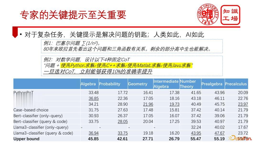 例 2:在大模型应用场景中同样如此。即使在数学解题任务上,也存在模型自身无法生成和预测的但具有关键作用的文本提示。当加入这些特定提示后,模型能立即输出正确答案。
