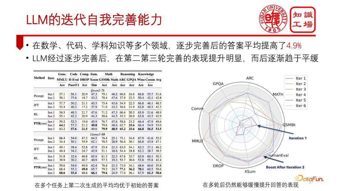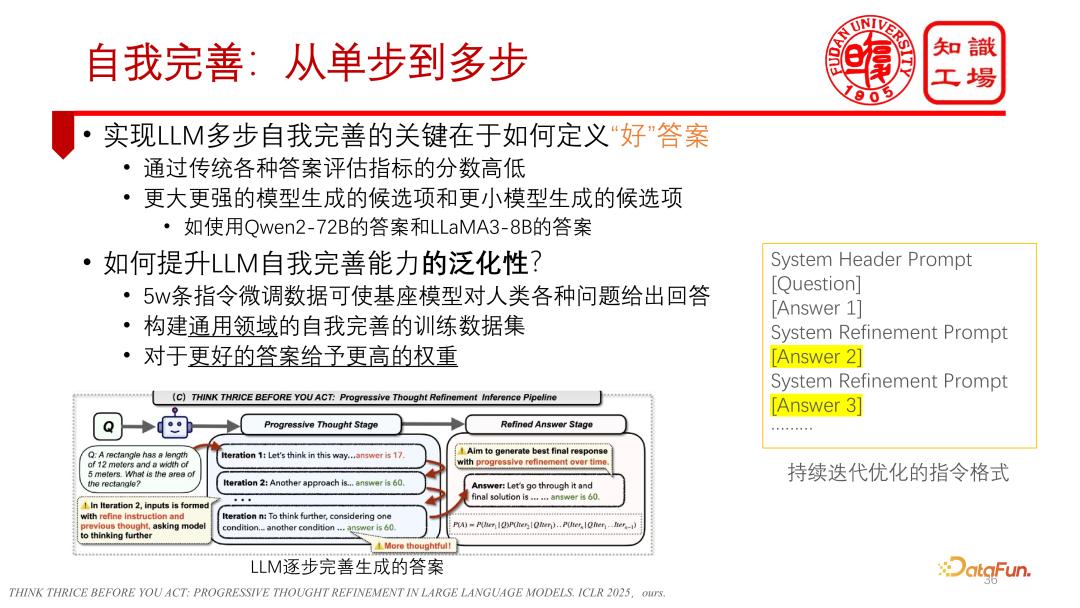 我们可以很自然地将这一方法进行推广,采用类似的方式让模型逐步优化其答案。如上面图所示的最右侧指令格式:给定一个问题,先生成多个不同版本的回答,然后通过要求模型进行修正、修改和提升,实现从较弱答案到较强答案的进化过程,最终通过指令微调将这一完整流程训练进模型中。