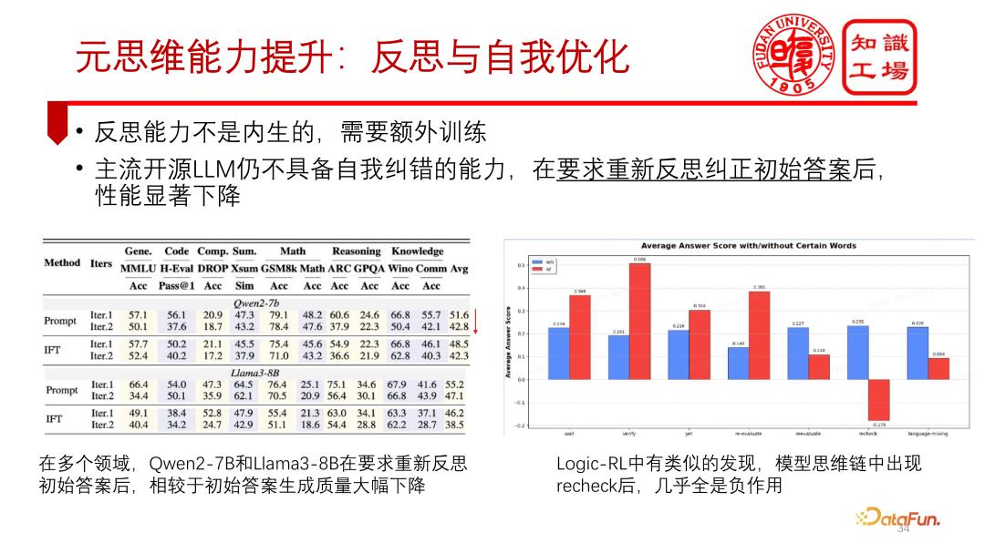 上面图中右侧图表,这是另一项关于反思效果的探索:当模型声称需要进行反思时,其实际反思效果如何?研究发现,模型往往只是“装模作样”的形式化地表示"需要反思",但反思结果多数情况下要么更加错误,要么维持原有错误水平。