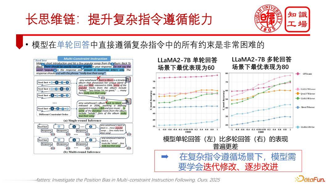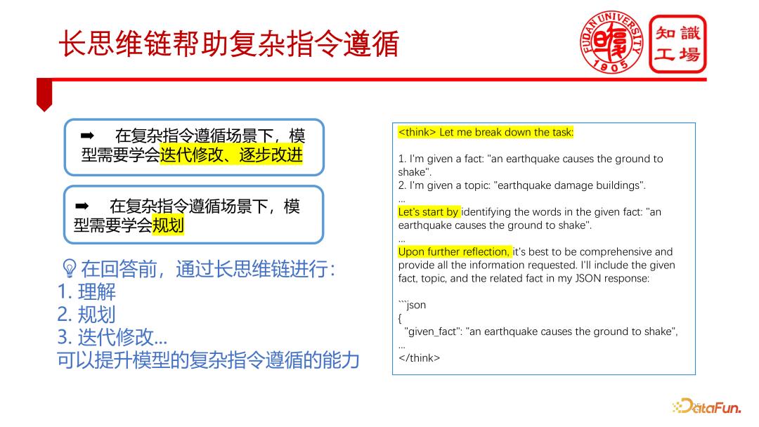 总结而言,若模型能够通过恰当的长思维链获得指令遵循能力的提升,那么这种长思维模式应当包含迭代修改、持续改进的思维方式,或是先规划后执行的思维框架。